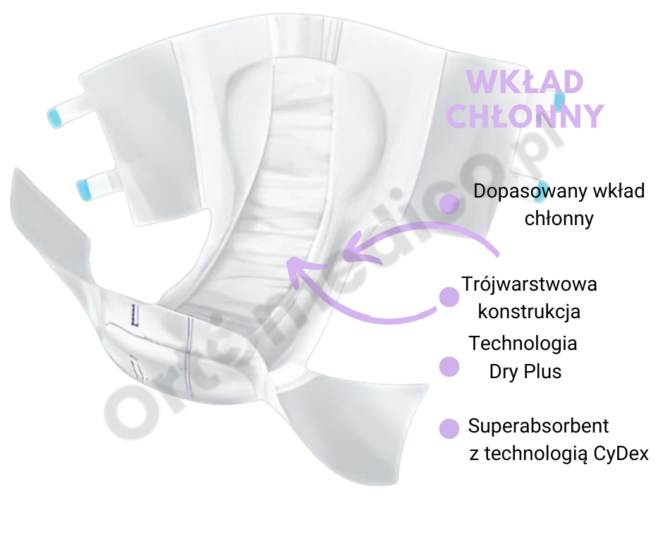 - 4 elastyczne przylepcorzepy (po 2 z każdej strony) umożliwiają wielokrotne zapinanie i odpinanie pieluchomajtek, co ułatwia ich zakładanie, nawet w pozycji leżącej.