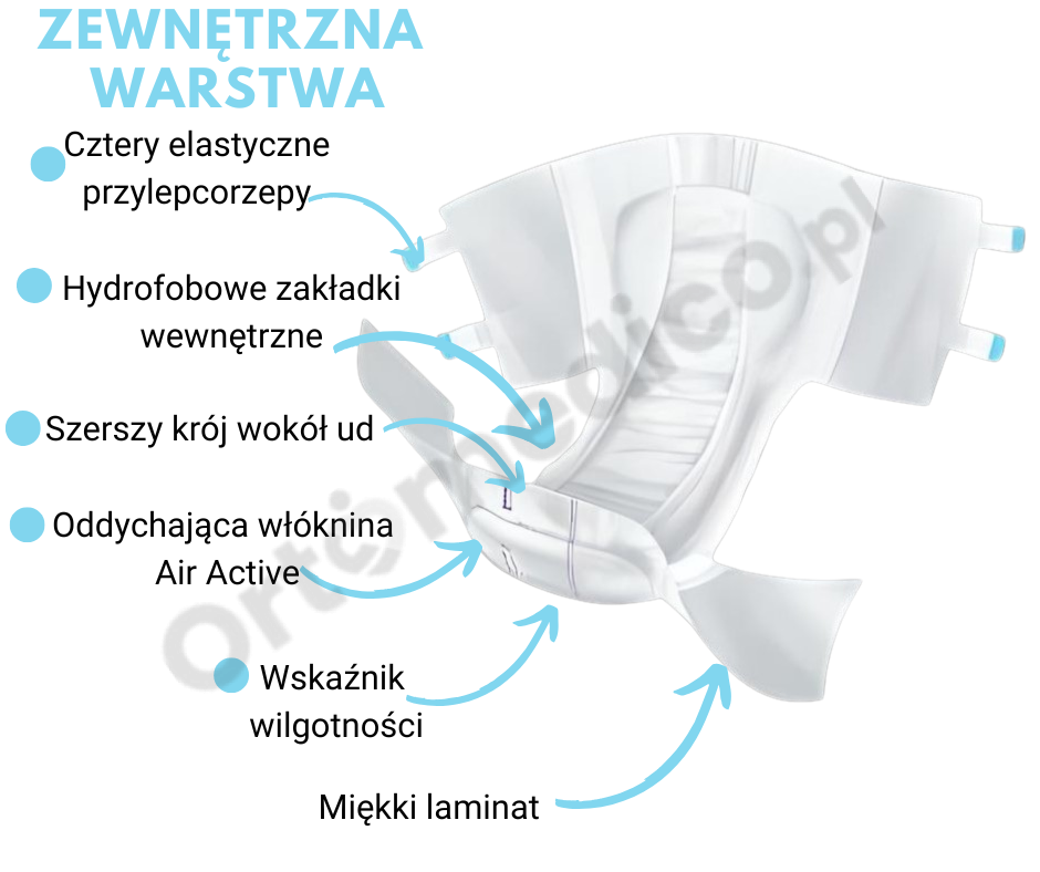 - Zewnętrzna warstwa pieluchomajtek w kolorze białym gwarantuje dyskretny wygląd.