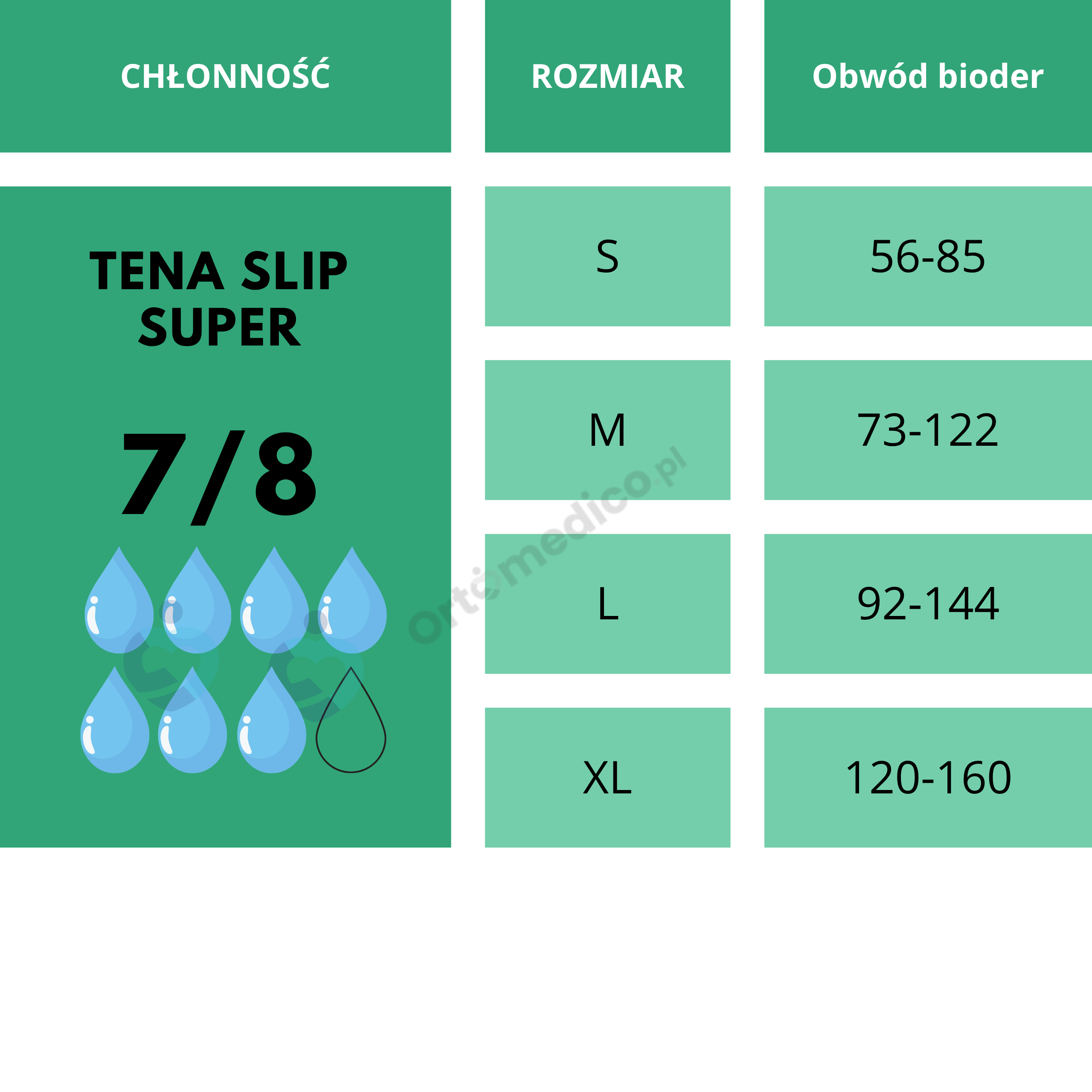 Pampersy dla dorosłego TENA Slip Super to wyrób przeznaczony dla osób ze średnim oraz ciężkim stopniem nietrzymania moczu i/lub kału. Sprawdzą się zarówno u osób aktywnych, jak i tych z ograniczoną mobilnością, np. leżących. Dzięki otwartej konstrukcji i regulowanym rzepom produkt łatwo dopasowuje się do sylwetki. Chłonność: 7/8 kropelek – idealna dla osób potrzebujących wysokiego poziomu zabezpieczenia.