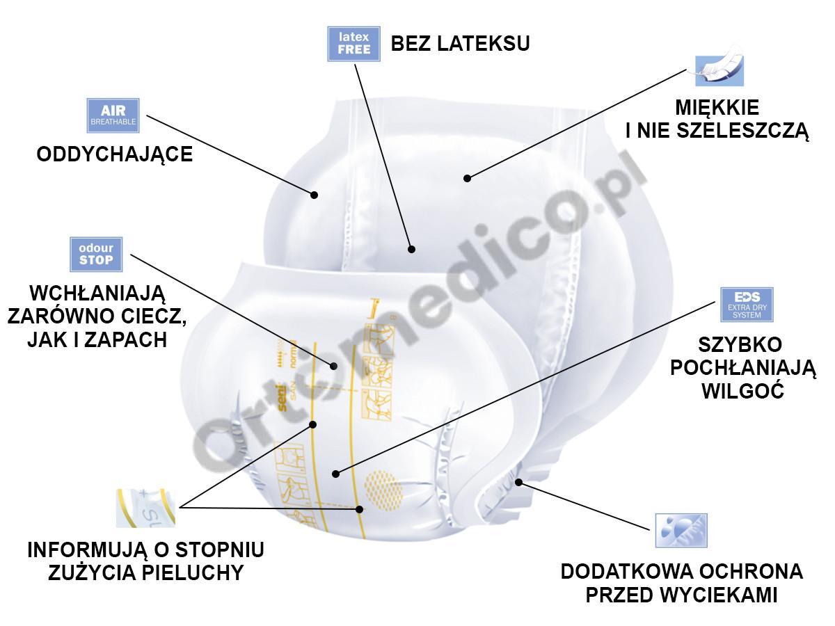 - Oddychalność - pieluchy anatomiczne Seni San są z materiałów przepuszczających parę wodną i uwalniających nadmiar ciepła, co pozwala skórze swobodnie oddychać