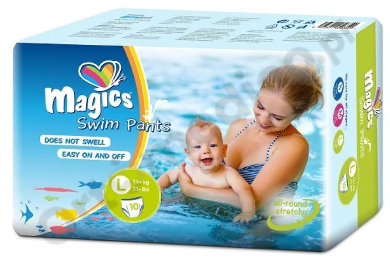 MAGICS Swimpants L to pieluchy kąpielowe stworzone z myślą o starszych dzieciach powyżej 14 kg, zwykle od około 2,5 do 4 roku życia. To świetny wybór dla dzieci, które potrzebują jeszcze dodatkowej ochrony, ale chcą uczestniczyć w zajęciach na basenie lub bawić się w wodzie podczas rodzinnych wakacji.
