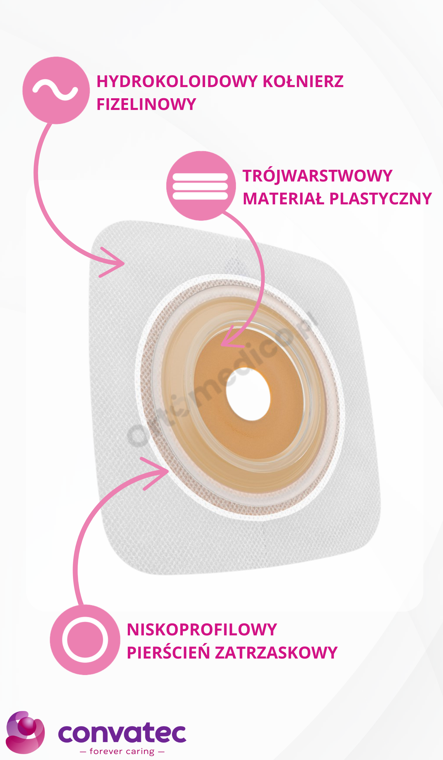 Dzięki dużym zdolnościom absorpcji wilgoci płytka zapobiega podciekaniu treści jelitowej, jednocześnie minimalizując ryzyko podrażnień skóry wokół stomii. Hydrokoloidowy pierścień tworzy ochronny kołnierz, który szczelnie przylega do skóry, chroniąc ją przed szkodliwym działaniem wydzieliny.