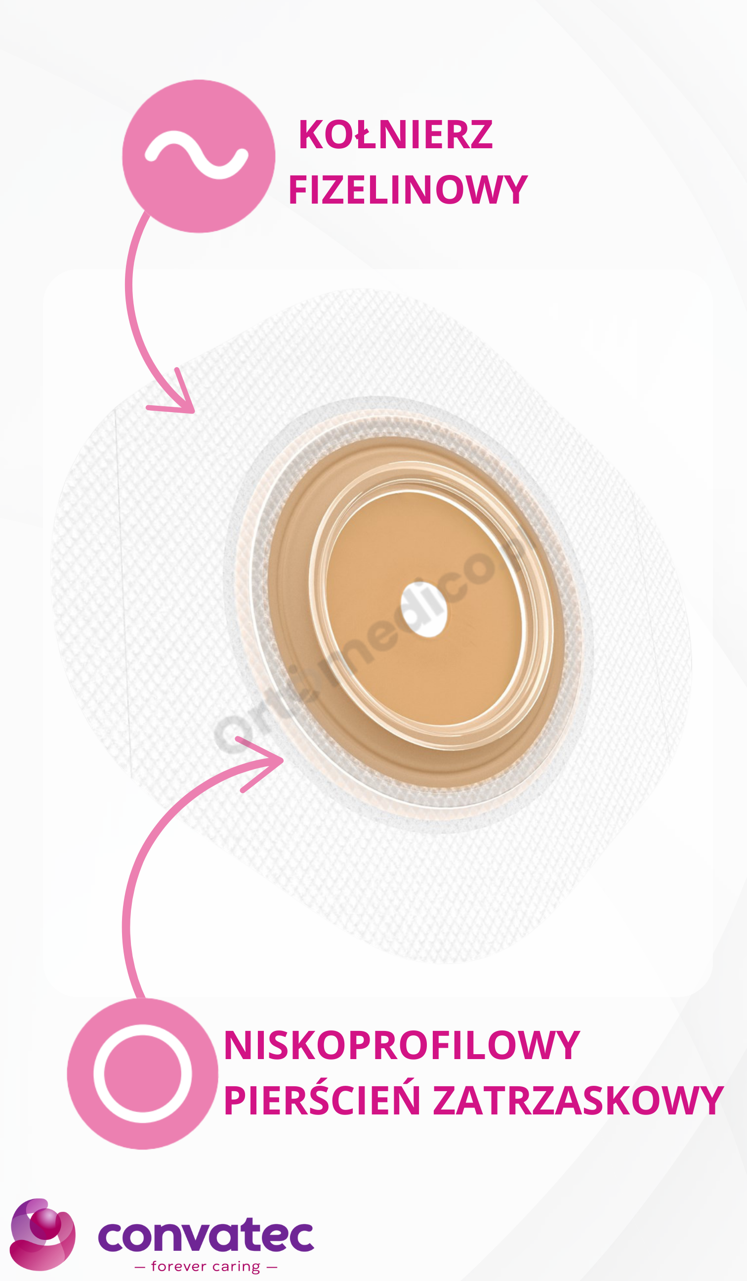 Łączenia płytki z workiem możliwe jest dzięki niskoprofilowanemu pierścieniowi zapinanemu na zatrzask. Zaletą jest to, że płytka może nawet przez kilka dni być przyklejona do skóry, a codziennej wymianie należy poddać tylko worek stomijny.