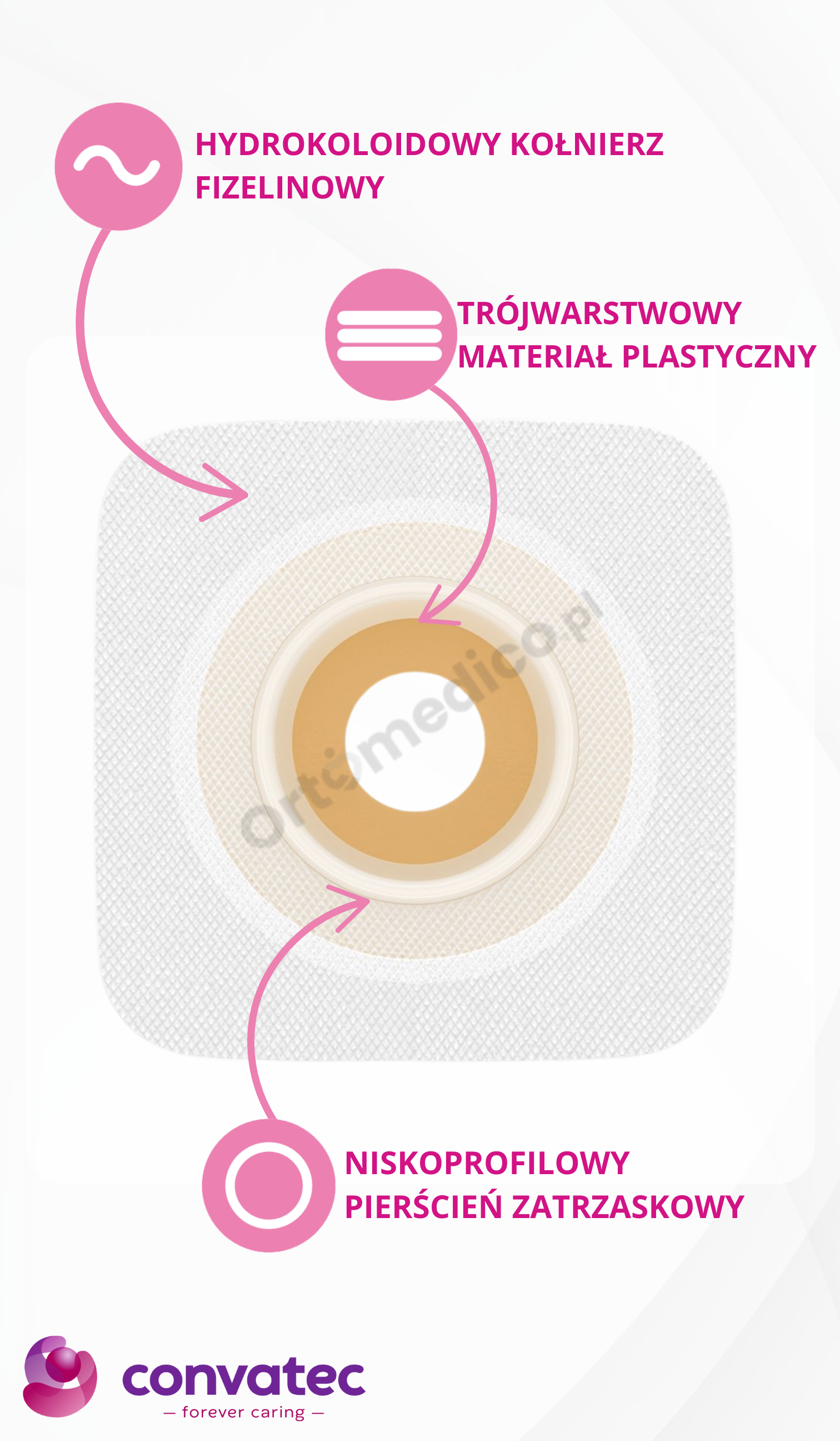 Plastyczny materiał kołnierza dostosowuje się do zmieniającego się kształtu stomii, gwarantując pełen komfort przez cały dzień.
