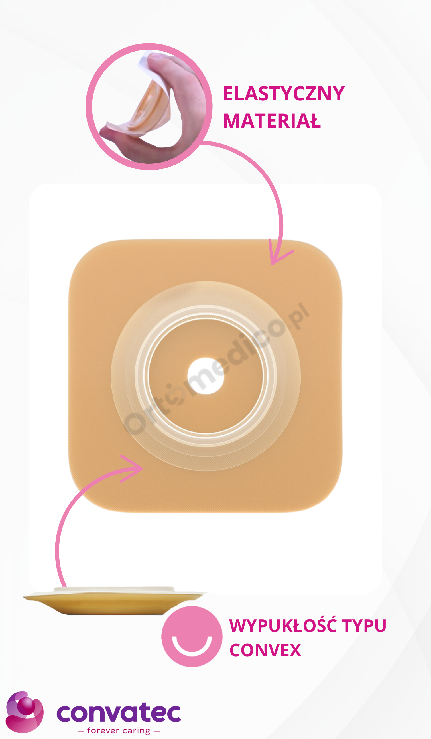 • Dostępność wersji z wypukłym przylepcem Convex pozwala na skuteczne zaopatrzenie stomii płaskich, wklęsłych oraz wyłonionych na powłokach brzusznych.