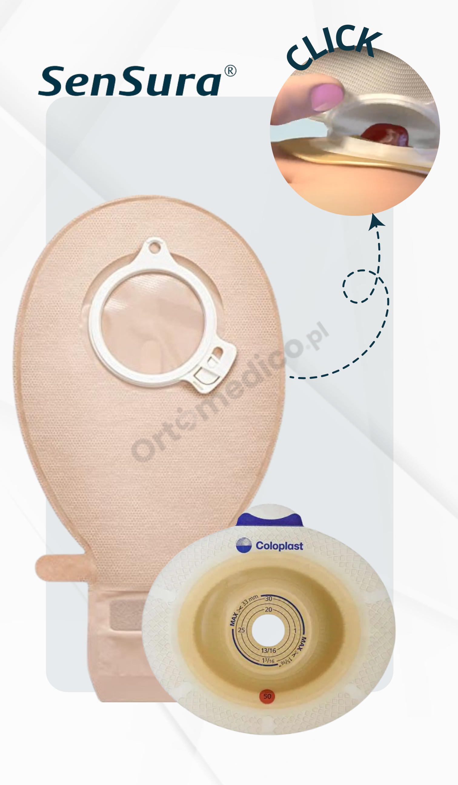 SenSura Click to zaawansowany system stomijny, który wyróżnia się dwuczęściową konstrukcją, oferującą niezawodność, bezpieczeństwo oraz wyjątkowy komfort użytkowania. Dzięki innowacyjnemu mechanizmowi zatrzaskowemu, system gwarantuje szczelne połączenie worka z płytką, co minimalizuje ryzyko wycieków i podrażnień skóry. Słyszalne "kliknięcie" przy mocowaniu to nie tylko znak prawidłowej instalacji, ale również pewność i spokój w codziennym użytkowaniu.