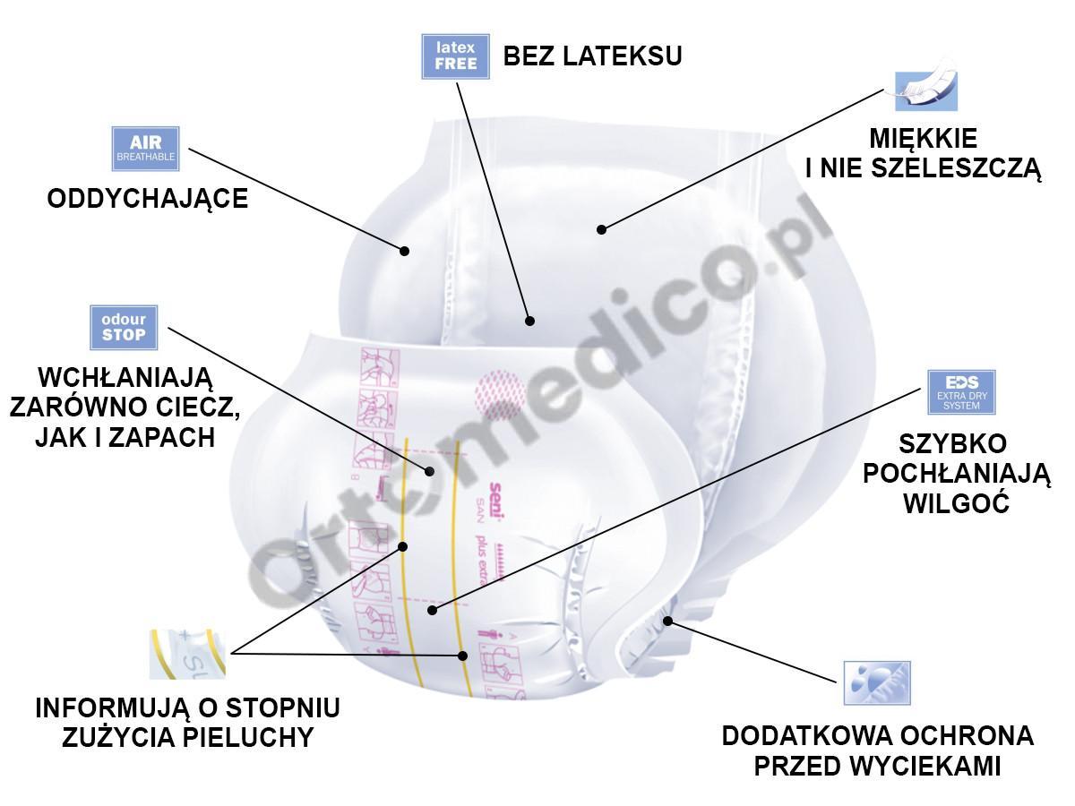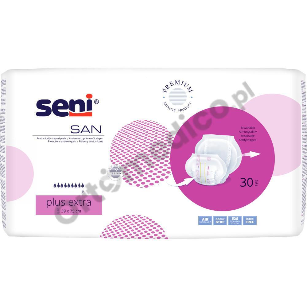 Pieluchy anatomiczne Seni San Plus Extra przeznaczone są dla osób z bardzo ciężkim stopniem nietrzymania moczu. Przeznaczone zarówno dla osób aktywnych jak i dla tych o ograniczonej mobilności. Chłonność jaką posiadają te pieluchy to 9/9 kropelek, dzięki czemu idealnie nadają się również na noc.