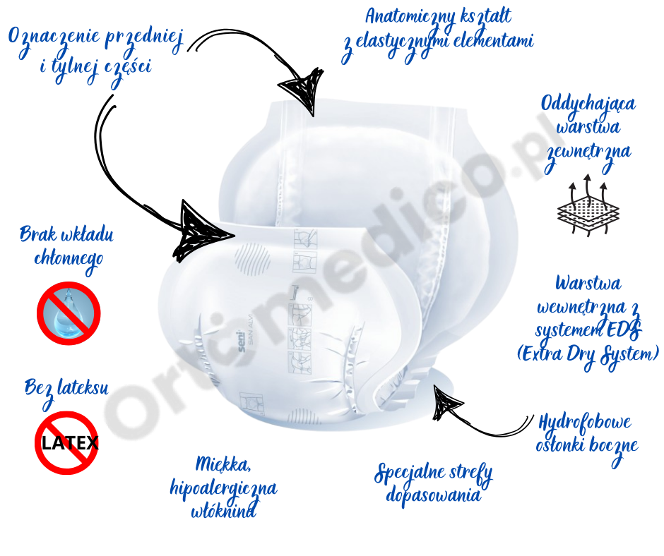 Uwaga: Seni San Alvi nie posiadają wkładu chłonnego, co oznacza, że produkt nie jest przeznaczony do wchłaniania luźnego stolca ani moczu.