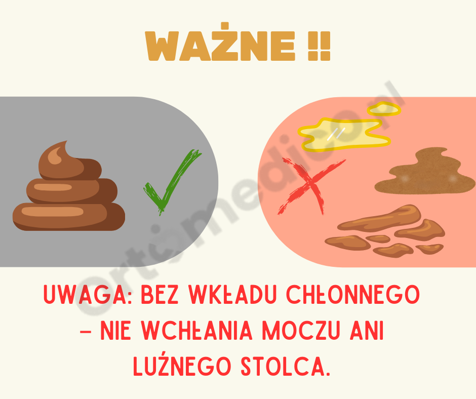 Brak wkładu chłonnego: Produkt nie wchłania moczu ani luźnego stolca, przeznaczony wyłącznie dla osób z nietrzymaniem stałego stolca.