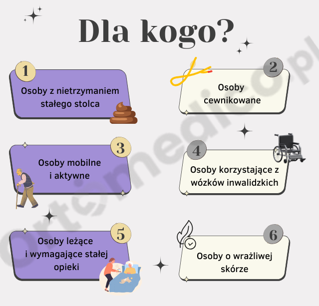 - Osoby korzystające z cewników lub urostomii – Idealne dla osób, które mają pełną kontrolę nad oddawaniem moczu (np. korzystających z cewników), ale wymagają ochrony przed nietrzymaniem stałego stolca.