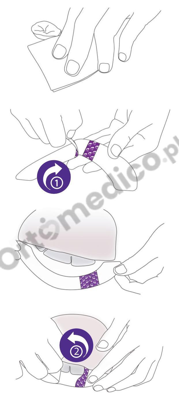d) Następnie, delikatnie usuń papierową warstwę zabezpieczającą oznaczoną numerem 2 z obu półpierścieni. Upewnij się, że całość jest równomiernie wygładzona i dobrze przylega do skóry.