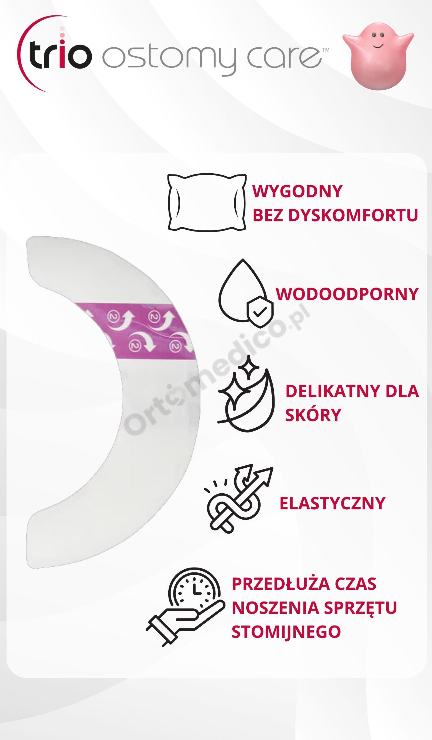- Uniwersalność – pasuje do różnych modeli sprzętu stomijnego i kształtów ciała.