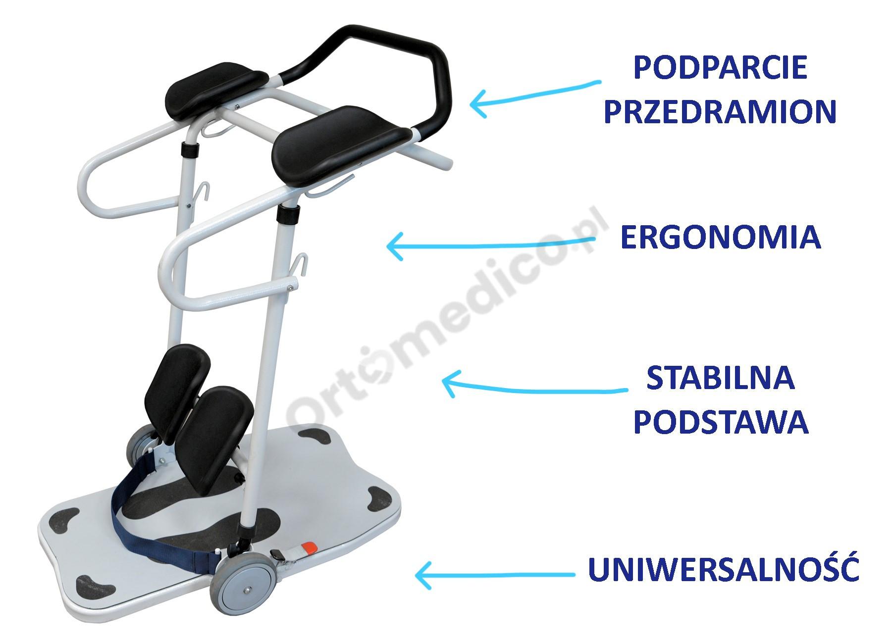 Przeciwwskazania: Pacjenci całkowicie niesprawni ruchowo, którzy nie mogą samodzielnie lub częściowo podnieść się do pozycji stojącej. Osoby z ciężkimi urazami kończyn dolnych, miednicy lub kręgosłupa, gdzie próba transferu mogłaby pogorszyć ich stan.