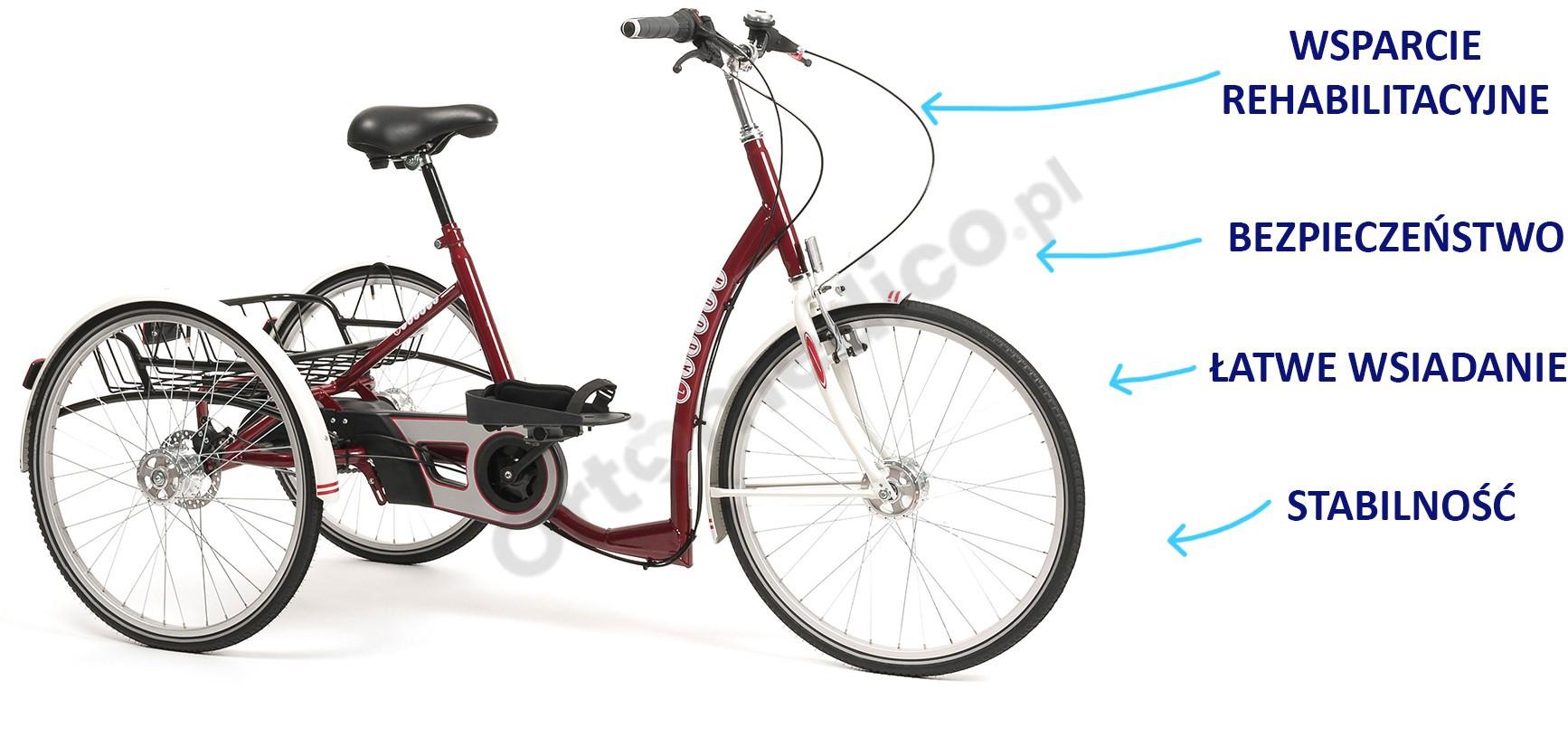 Nisko zawieszona rama ułatwia wsiadanie i zsiadanie z roweru, co jest kluczowe dla osób z ograniczeniami ruchowymi. Konstrukcja trójkołowa zapewnia pełną stabilność podczas jazdy i postoju.