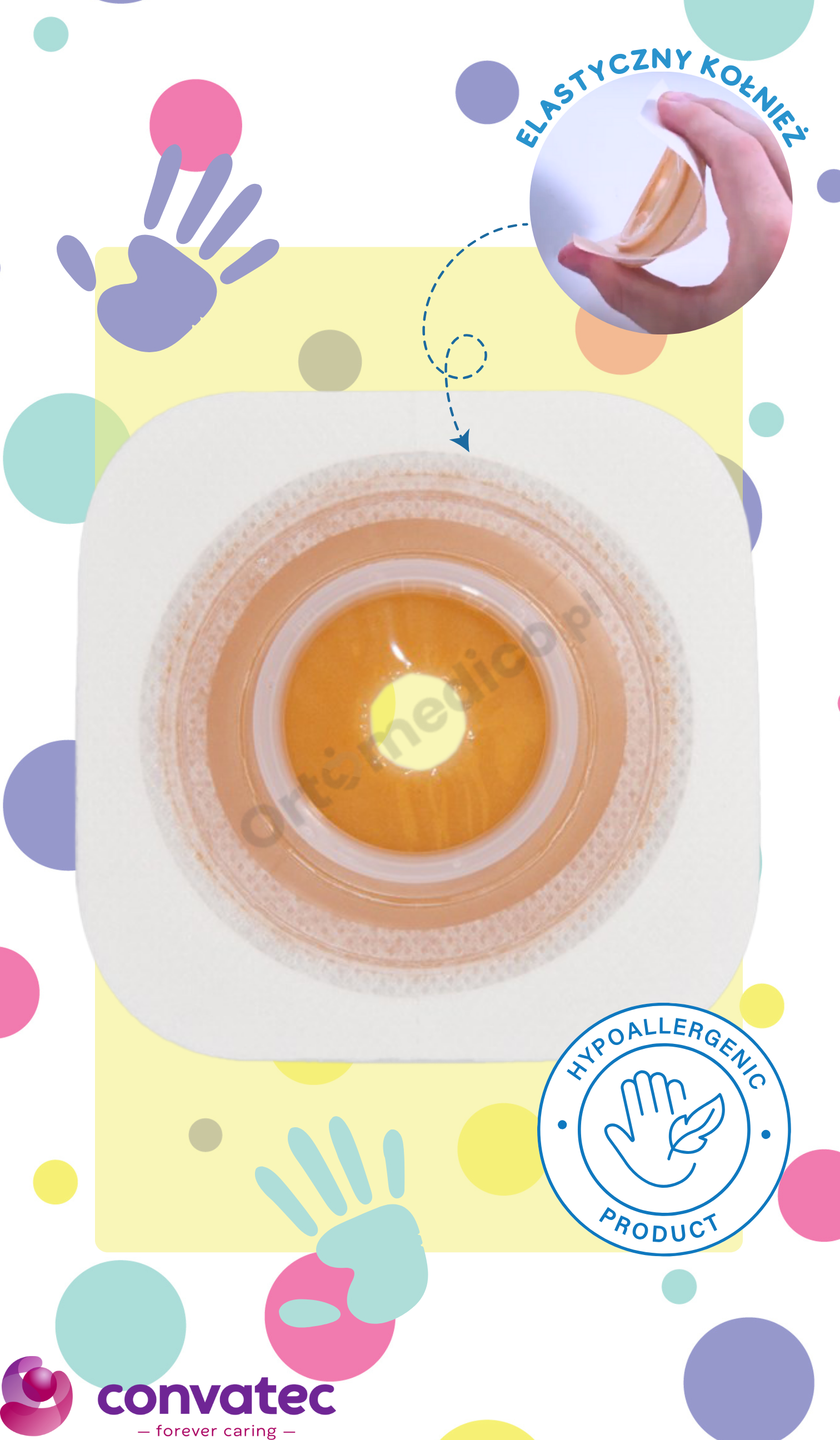 Płytka może być docięta do rozmiaru i kształtu stomii dziecka, co pozwala na idealne dopasowanie produktu.
