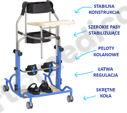 Solidna budowa urządzenia w połączeniu z ergonomicznymi pelotami kolanowymi oraz szerokimi pasami piersiowym i biodrowym gwarantuje pełne bezpieczeństwo i poczucie stabilizacji podczas pionizacji.