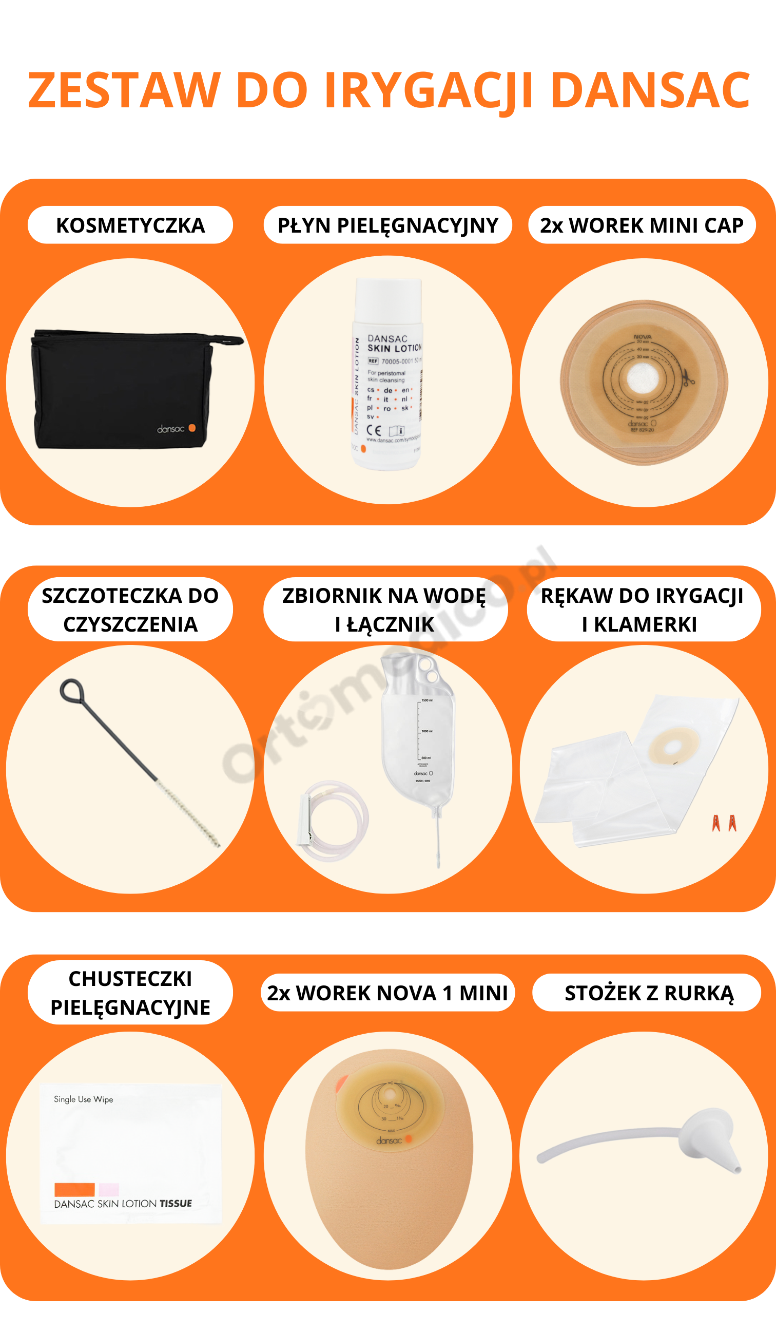 Zestaw do irygacji Dansac 900-35 przeznaczony jest do przeprowadzania domowej irygacji jelita grubego u pacjentów z kolostomią. Zabieg irygacji pomaga w: