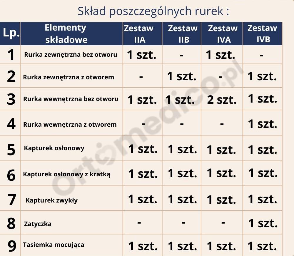 Tabelka przedstawiająca skład poszczególnych zestawów rurek tracheostomijnych: