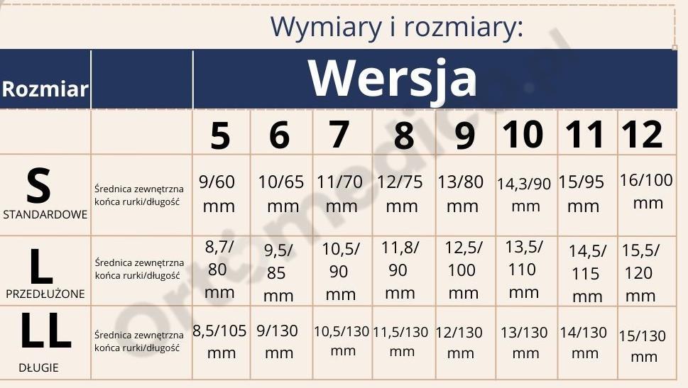 (Wymiary podane w milimetrach) Rozmiary rurek produkwane są od rozmiaru 5 do 12.