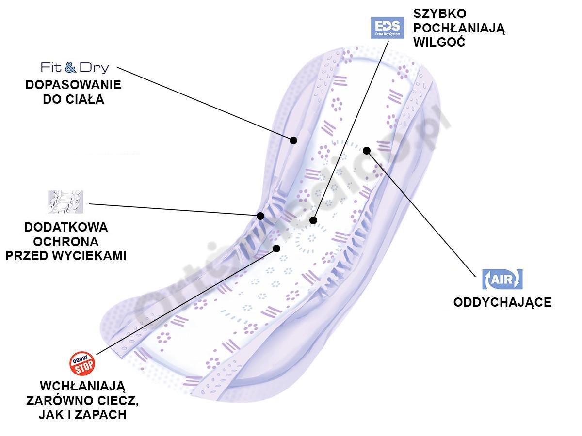 - Fit & Dry posiada anatomiczny kształt poprzez zwężenie wkładu chłonnego w kroku oraz przeniesienie masy chłonnej do części środkowej, czyli tam gdzie najbardziej liczy się chłonność