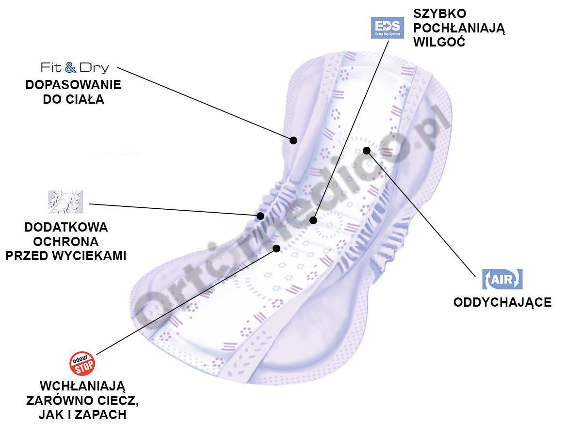 - Fit & Dry posiada anatomiczny kształt poprzez zwężenie wkładu chłonnego w kroku oraz przeniesienie masy chłonnej do części środkowej, czyli tam gdzie najbardziej liczy się chłonność