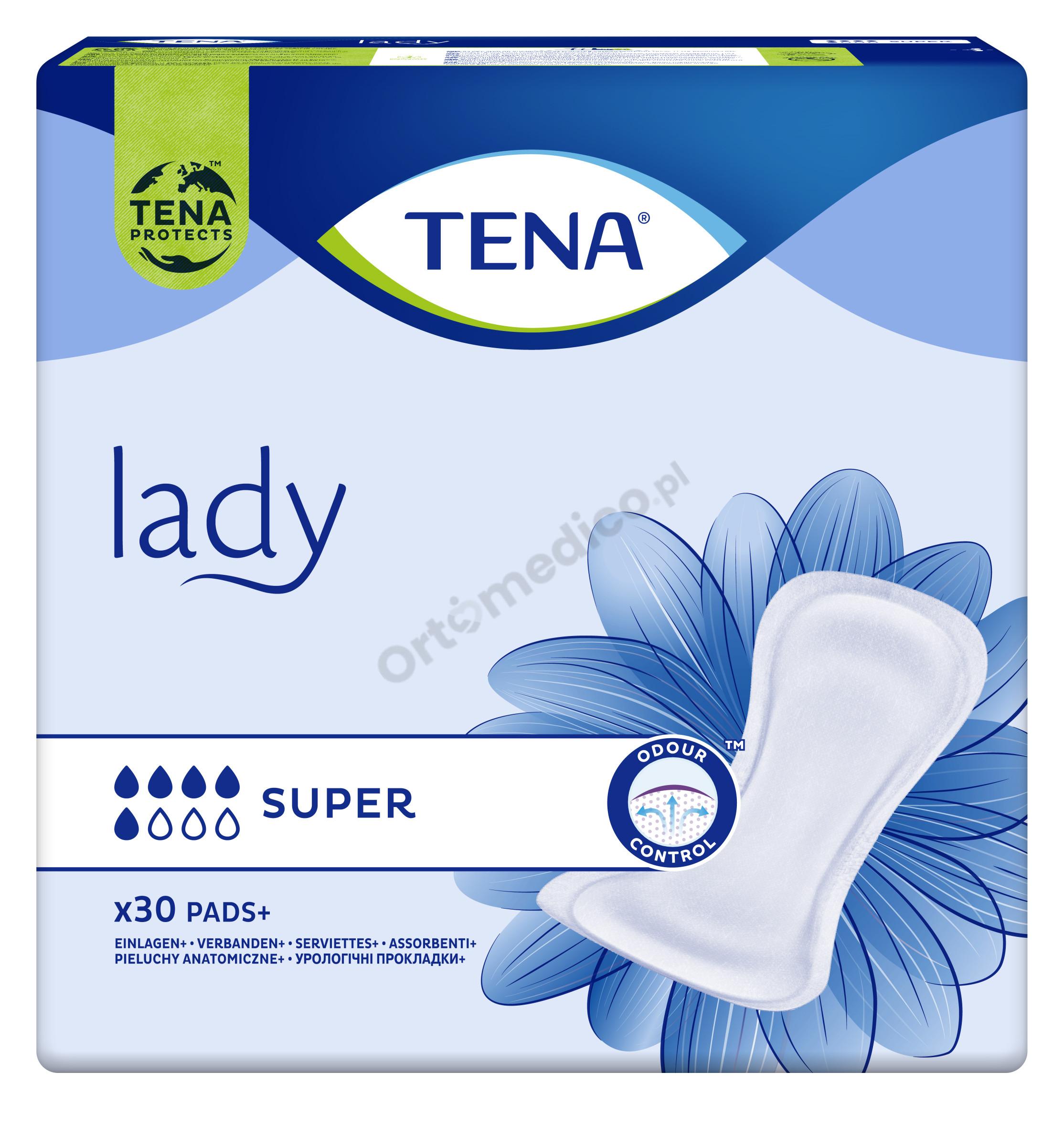 Wkładki urologiczne TENA Lady Super przeznaczone są dla kobiet z lekkim i średnim nietrzymaniem moczu. Przeznaczone dla kobiet prowadzących aktywny tryb życia, mobilnych. Chłonność jaką posiadają te wkładki to 5/8 kropelek i długość 43 cm.