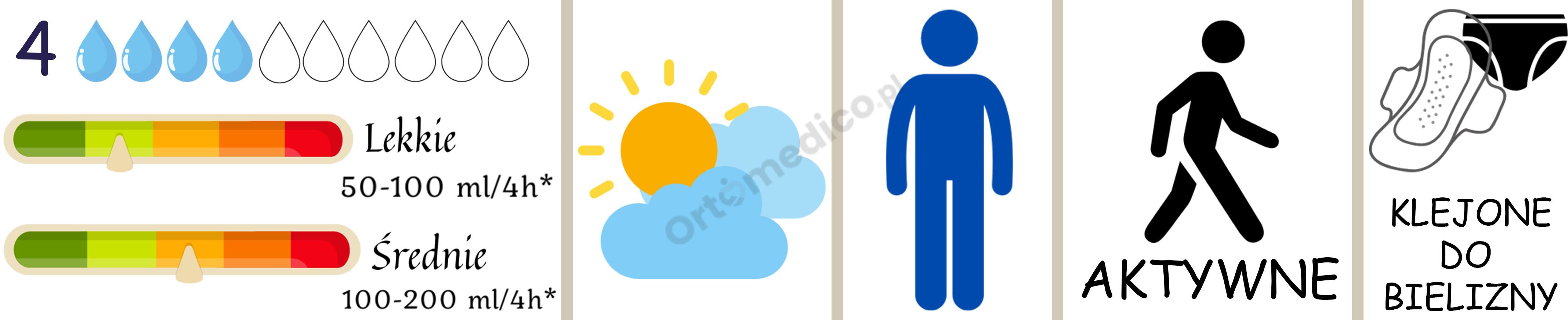 - Poziom chłonności 4.0 krople został opracowany z myślą o lekkim i średnim nietrzymaniu moczu, zapewniając niezawodną ochronę przez cały dzień.