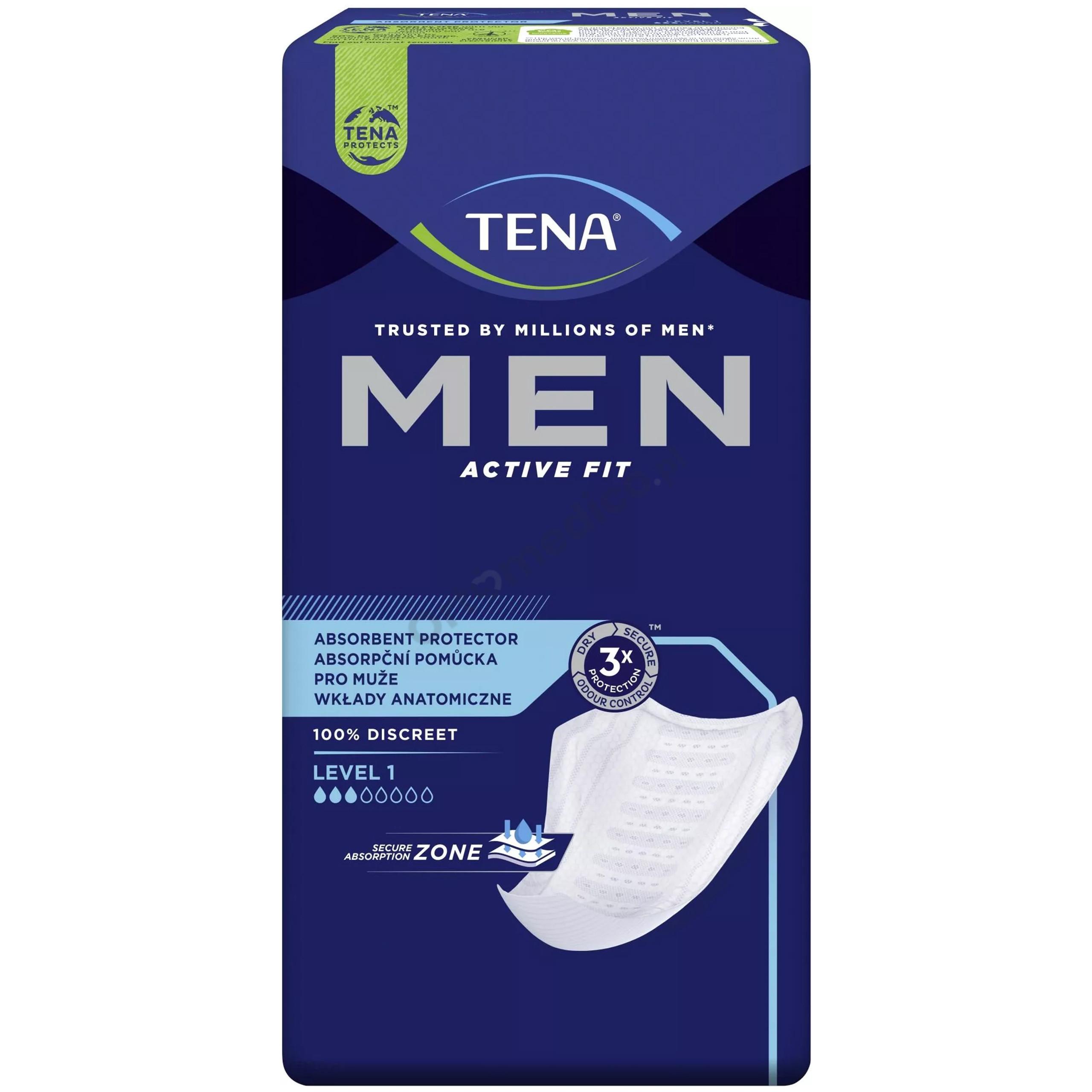Wkładki chłonne TENA Men Active Fit Level 1 przeznaczone są dla aktywnych mężczyzn, którzy potrzebują pewnej ochrony przed nietrzymaniem moczu. TENA Men oferuje mężczyznom w każdym wieku skuteczną kontrolę nad lekkim wyciekiem moczu i lekkim nietrzymaniem moczu. Chłonność jaką posiadają te wkładki to 3/8 kropelek.