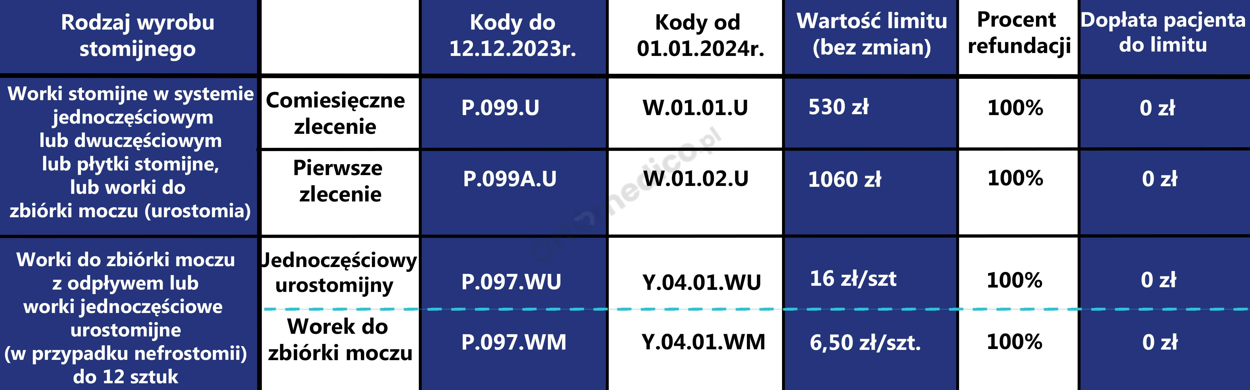Od 1 stycznia 2023 roku zmianie uległa refundacja wyrobów stomijnych. Ustanowiono 2 zlecenia na sprzęt stomijny (P.99 worki i płytki i P.141 akcesoria) oraz osobne zlecenie (P.99.A, P.141.A) dla pacjentów nowo operowanych z podwójnym limitem. Podwyższono limity: w kolostomii i ileostomii do 450 zł ; w urostomii do 530 zł, akcesoria 120 zł w tym 20% dopłaty pacjenta. Wystawiający zlecenie będzie zlecał ryczałt lub jego część lub jego wielokrotność w przypadku pacjentów z 47ZN, 47ZND, 47DN.