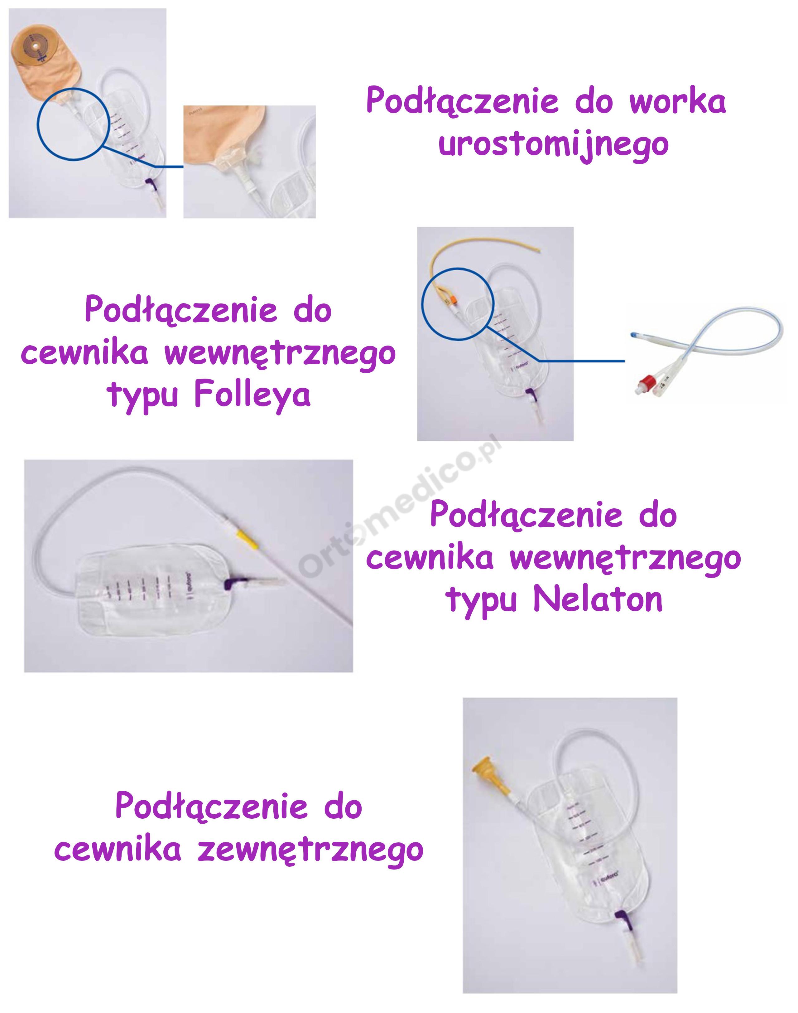 - Uniwersalny łącznik w kształcie stożka umożliwia łatwe podłączenie worka do cewnika wewnętrznego (urologicznego), cewnika zewnętrznego lub worka urostomijnego.
