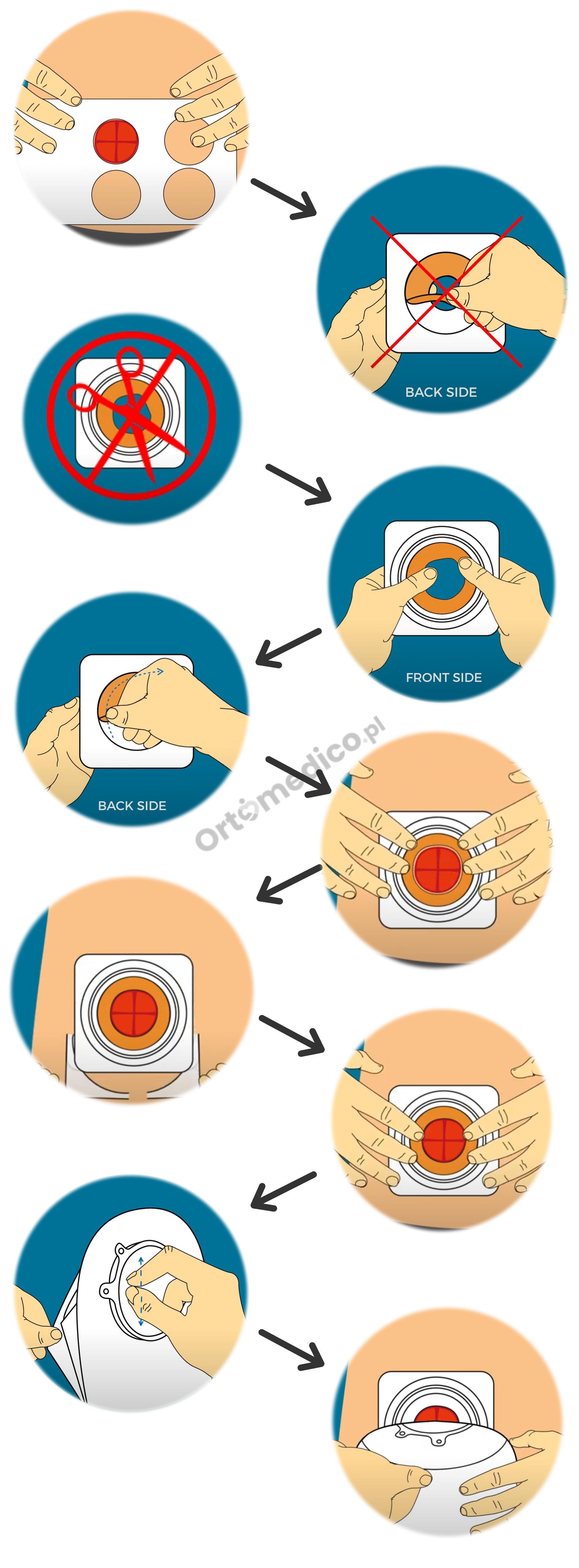 1.       Przygotuj płytkę. Zmierz stomię i odrysuj kształt na folii zabezpieczającej. Wytnij odrysowany kształt. PAMIĘTAJ między wyciętą krawędzią a pierścieniem zatrzaskowym zostaw minimum 1 cm !