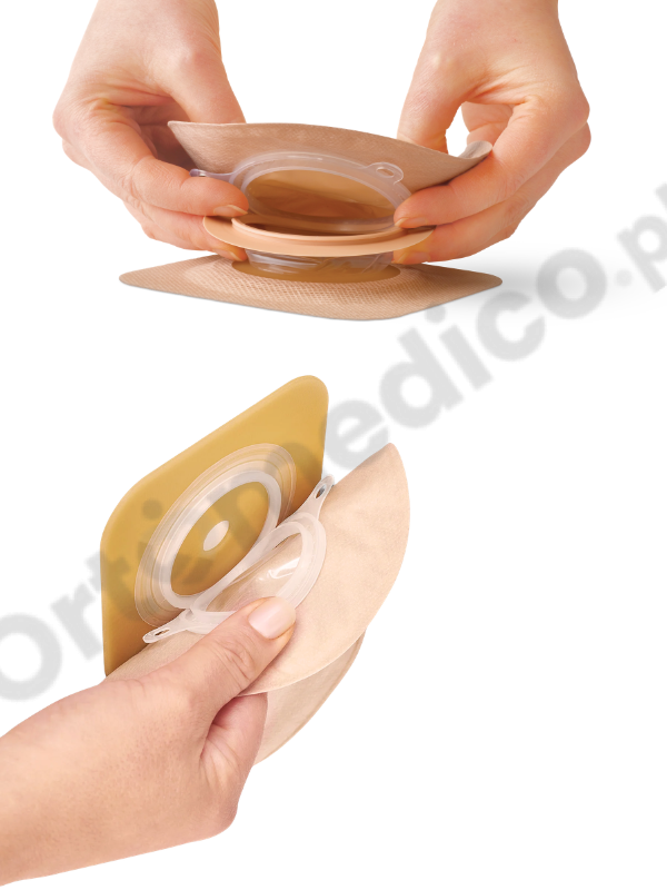 Łączenie płytki i worka możliwe jest dzięki niskoprofilowanemu pierścieniowi zapinanemu na zatrzask. Zaletą jest to, że płytka może nawet przez kilka dni być przyklejona do skóry, a codziennej wymianie należy poddać tylko worek stomijny.