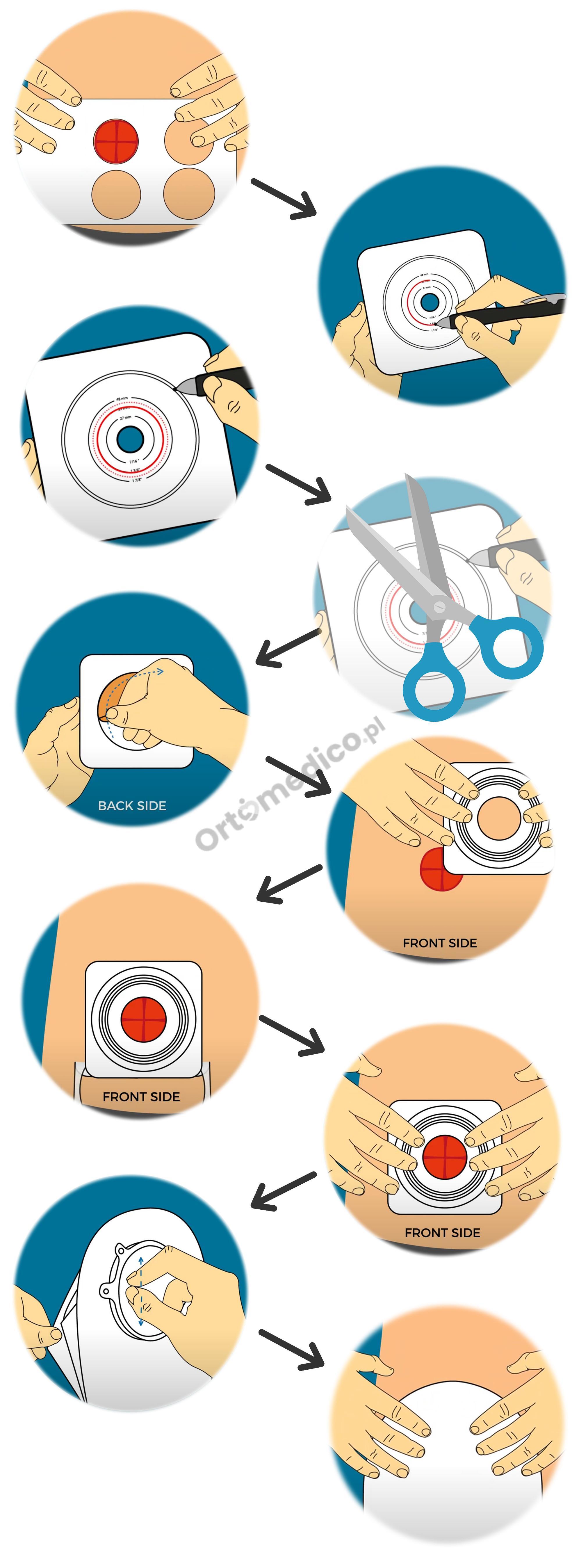 1. Przygotuj płytkę. Zmierz stomię i odrysuj kształt na folii zabezpieczającej. Wytnij odrysowany kształt. PAMIĘTAJ między wyciętą krawędzią a pierścieniem zatrzaskowym zostaw minimum 1 cm !