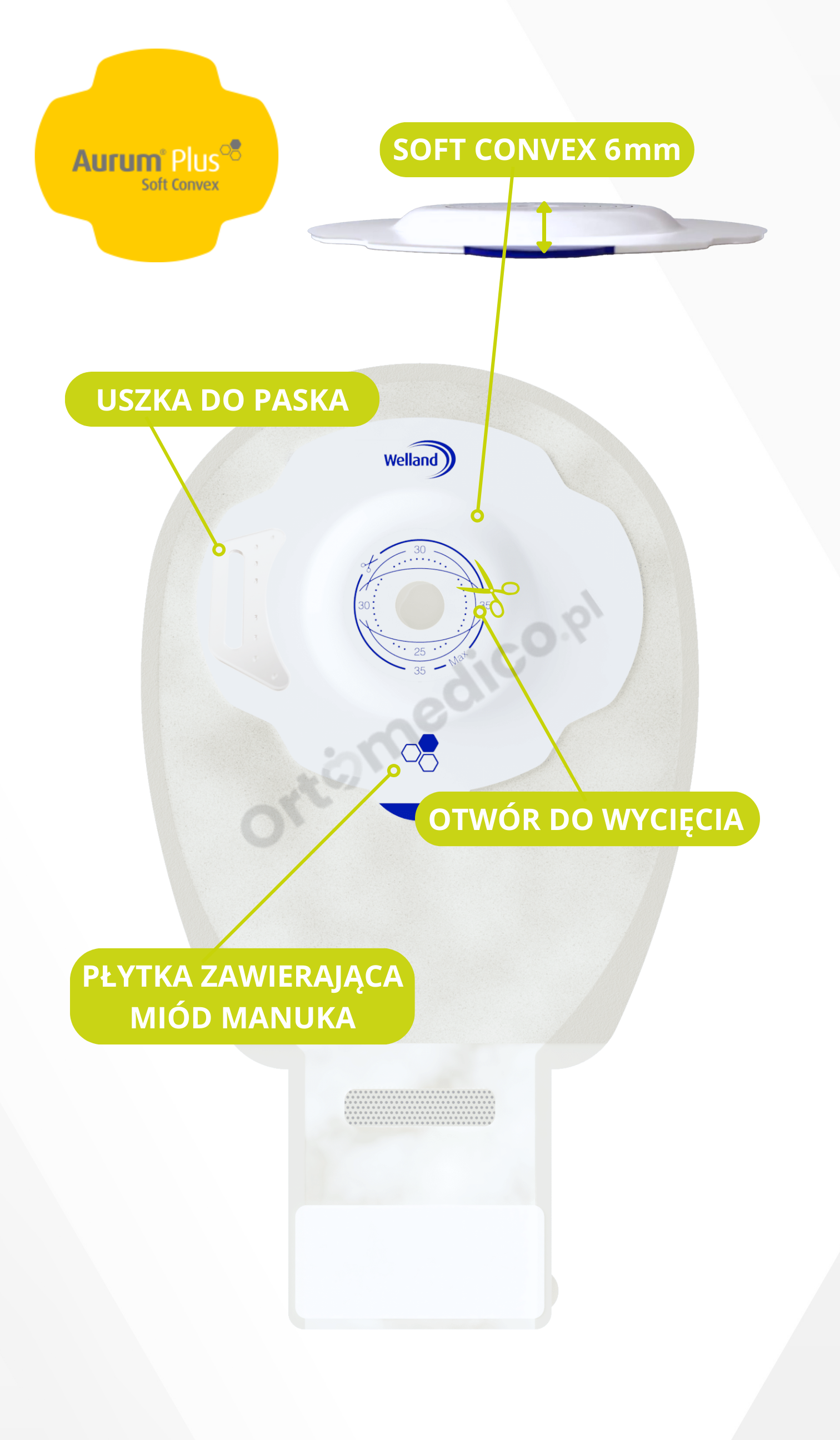 Aurum Plus® Convex Soft to innowacyjny worek stomijny jednoczęściowy, stworzony specjalnie z myślą o osobach ze stomią płaską i wklęsłą. Wyróżnia się wyjątkowym połączeniem technologii medycznej z naturalną ochroną skóry dzięki dodatkowi miodu Manuka. Jego miękki, elastyczny i wypukły przylepiec Convex zapewnia idealne dopasowanie nawet w trudnych anatomicznie miejscach, a praktyczne rozwiązania, takie jak filtr Dual-Carb®i czy okienko kontrolne, sprawiają, że codzienna pielęgnacja stomii staje się prostsza i bardziej komfortowa.