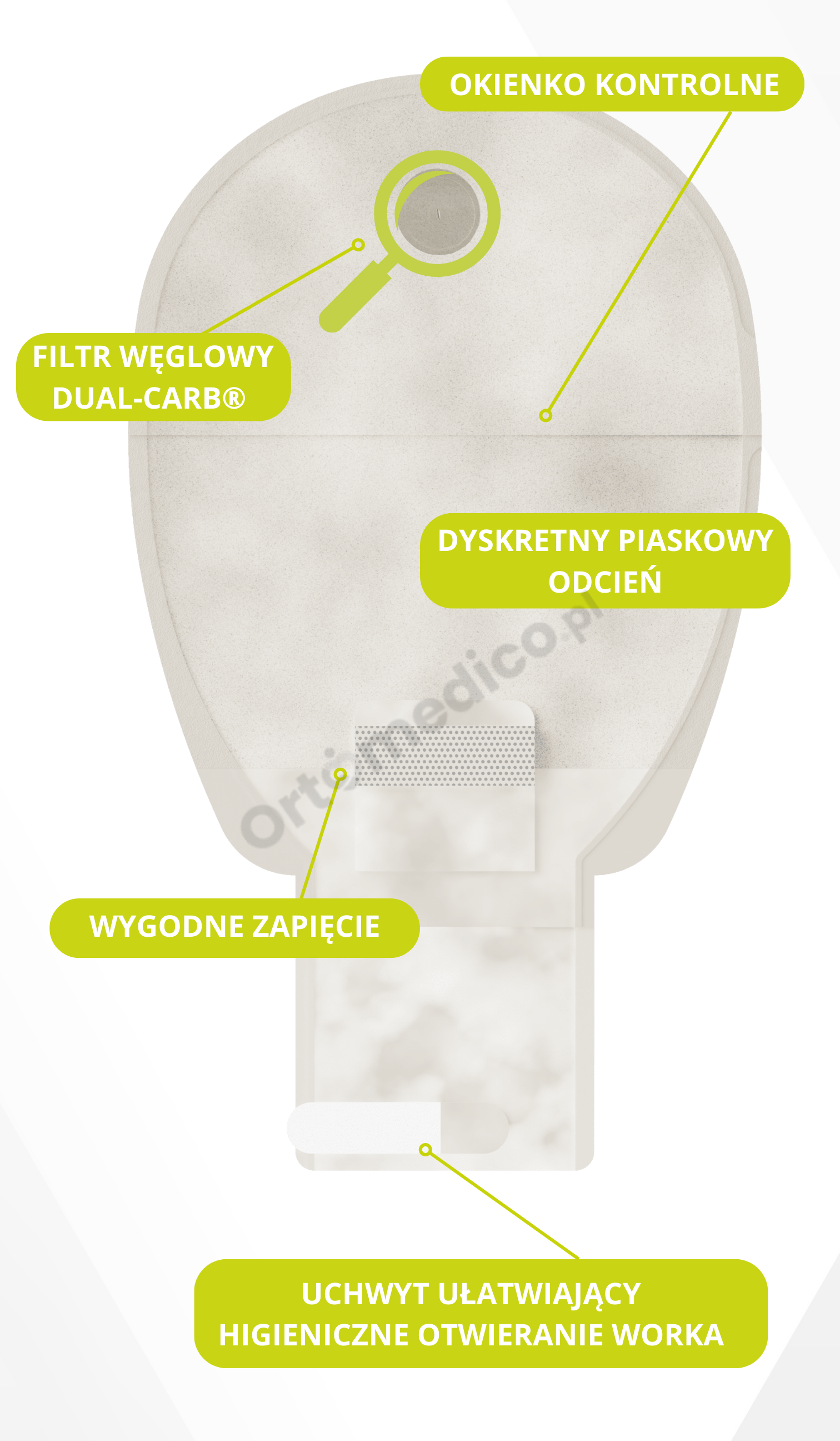 - okienko kontrolne daje możliwość bieżącego monitorowania stomii i zawartości worka bez potrzeby jego zdejmowania.