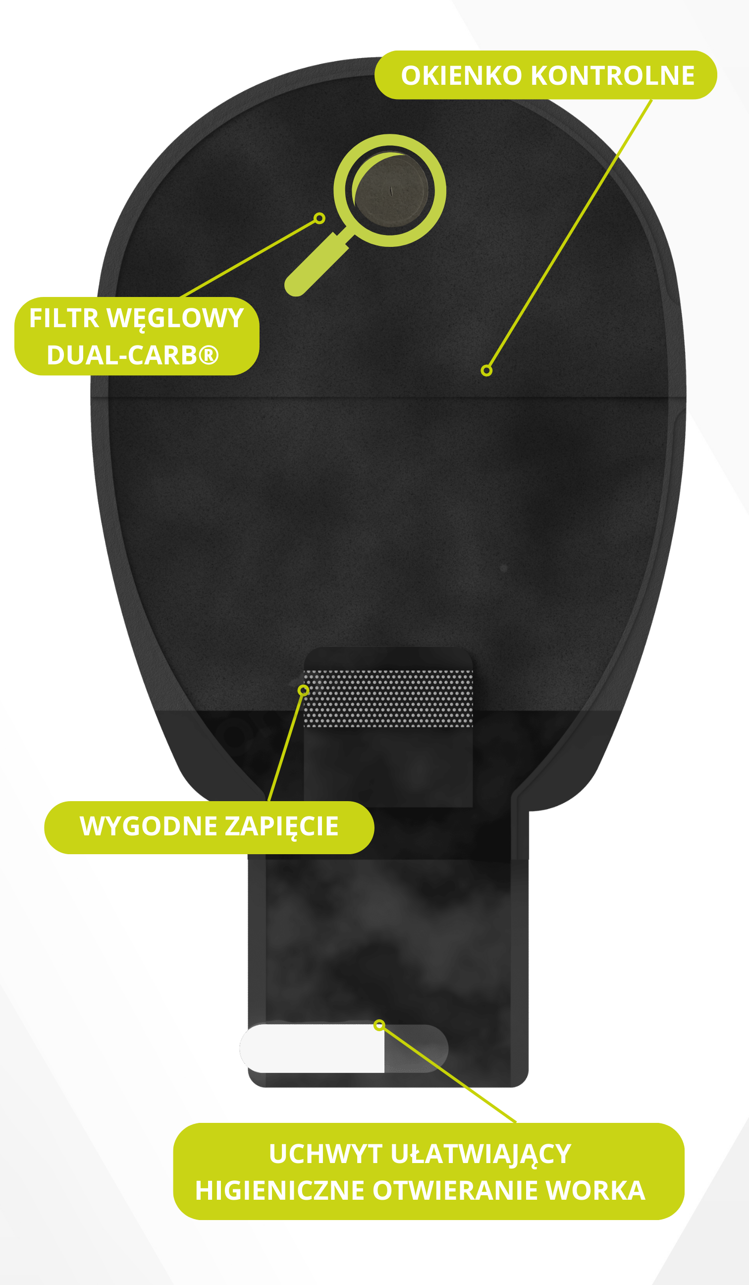 • ceniących sobie łatwość obsługi i możliwość bieżącej kontroli stomii dzięki okienku.
