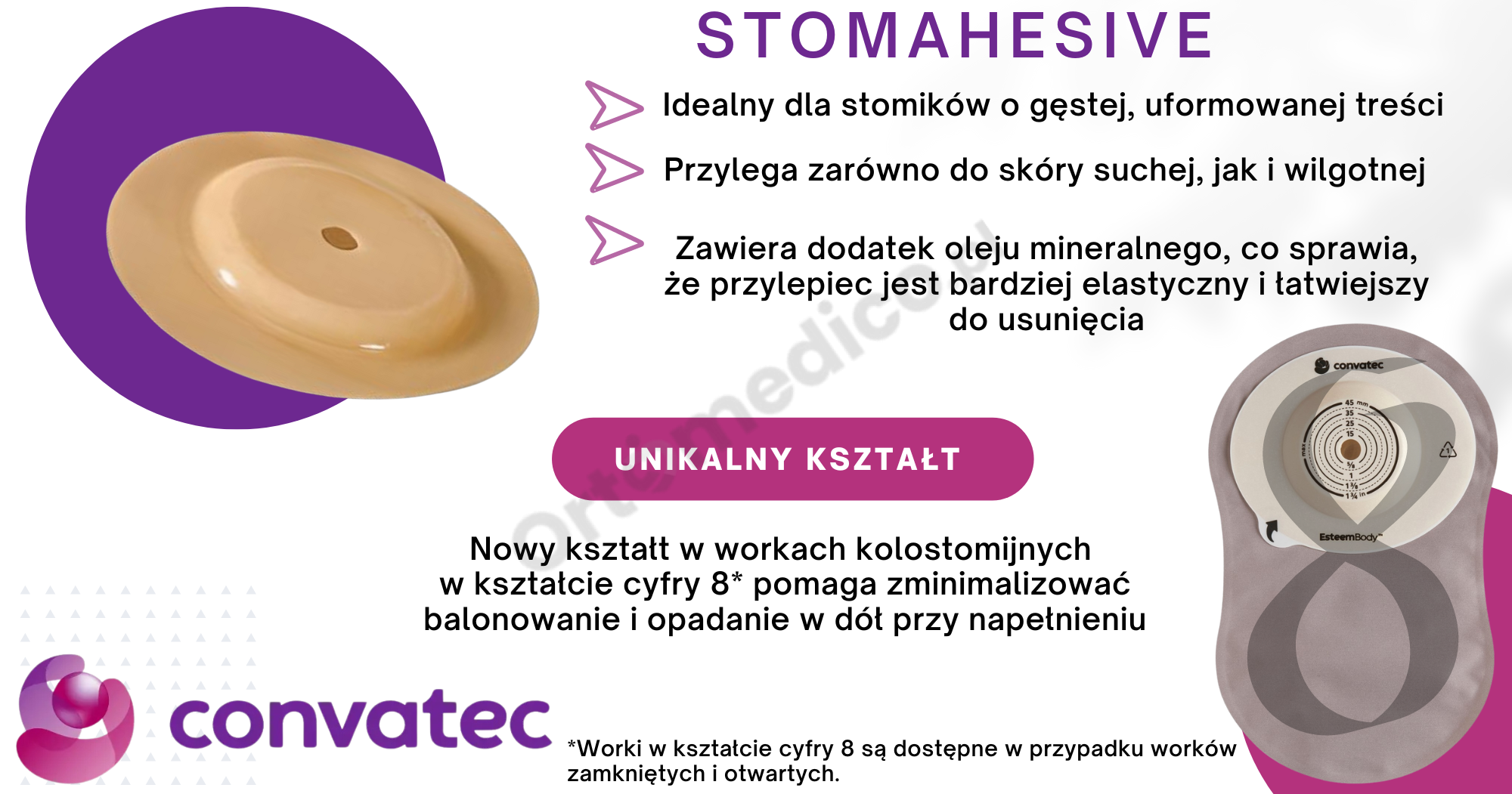 Kieszeń w kształcie "8" – Innowacyjny kształt kieszeni, zaprojektowany tak, aby zmniejszyć balonowanie i opadanie worka podczas napełniania. Dzięki temu worek lepiej przylega do ciała, minimalizując dyskomfort i poprawiając dyskrecję.