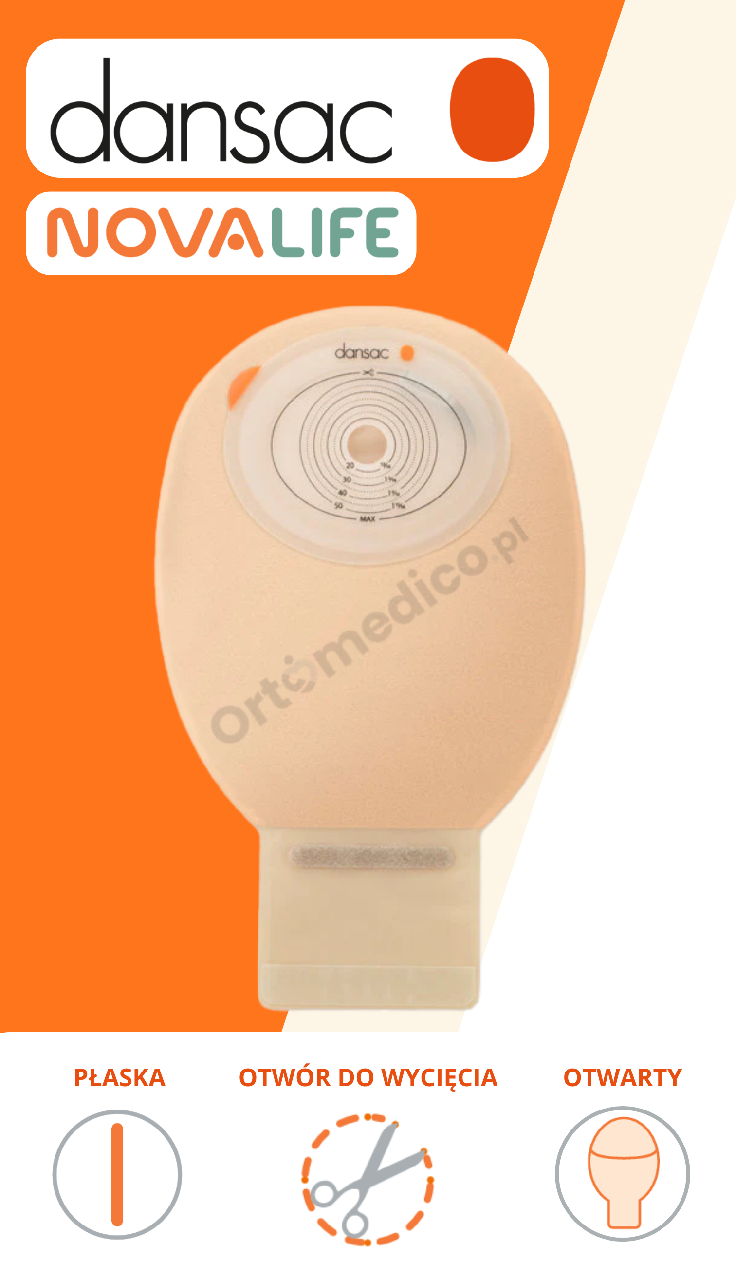 - Kolostomia lub ileostomia z wyłonieniem okrągłym lub owalnym, wymagająca dopasowania otworu do kształtu stomii (do 55x70 mm).