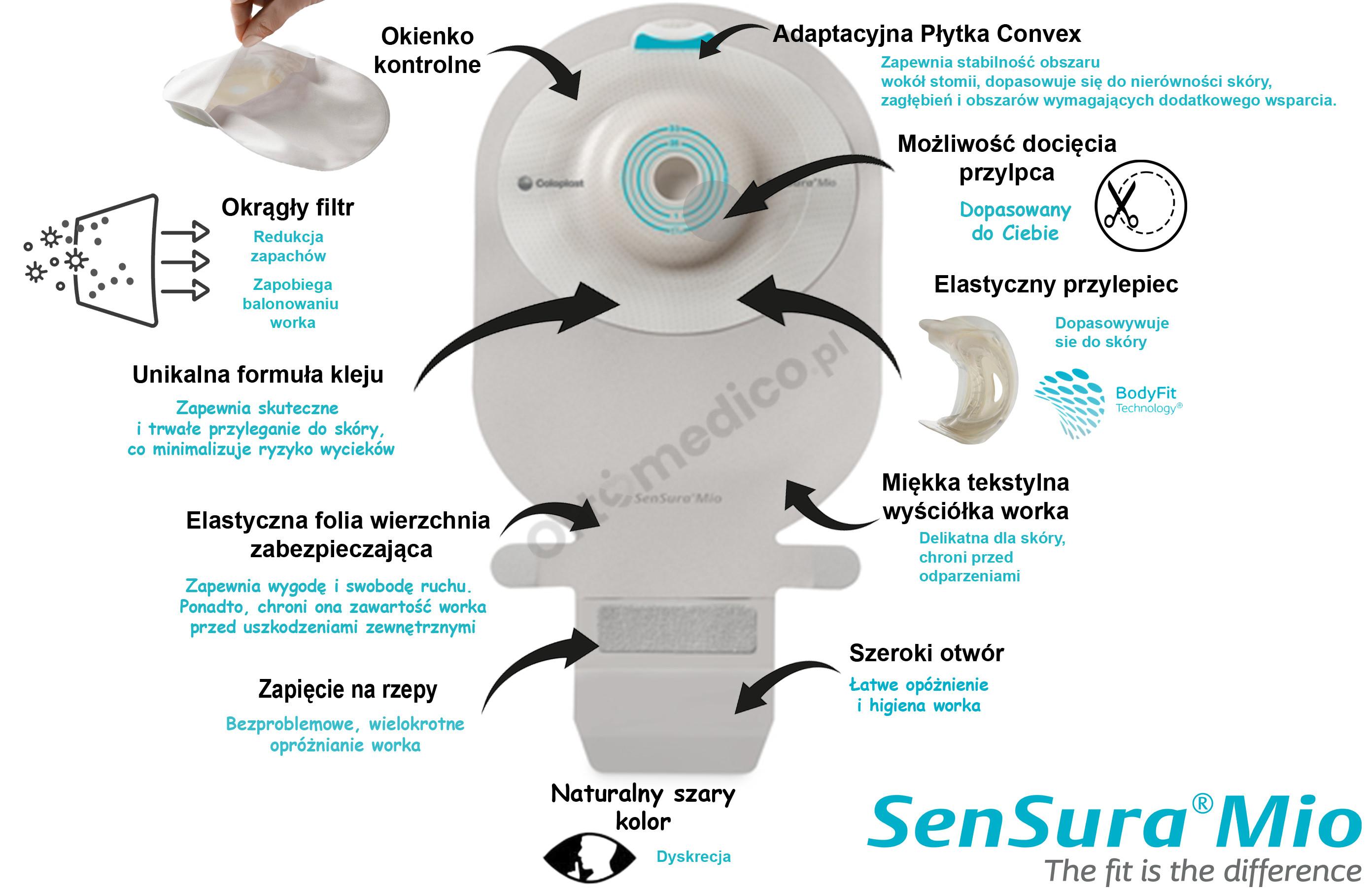 Worek stomijny SenSura® Mio Convex to innowacyjne rozwiązanie dla osób z stomią, które potrzebują szczególnej ochrony i dopasowania. Dzięki swoim zaawansowanym cechom technicznym oraz dbałości o komfort i dyskrecję użytkownika, jest to sprzęt, który zapewnia nie tylko bezpieczeństwo, ale także pewność siebie i komfort w codziennym życiu.