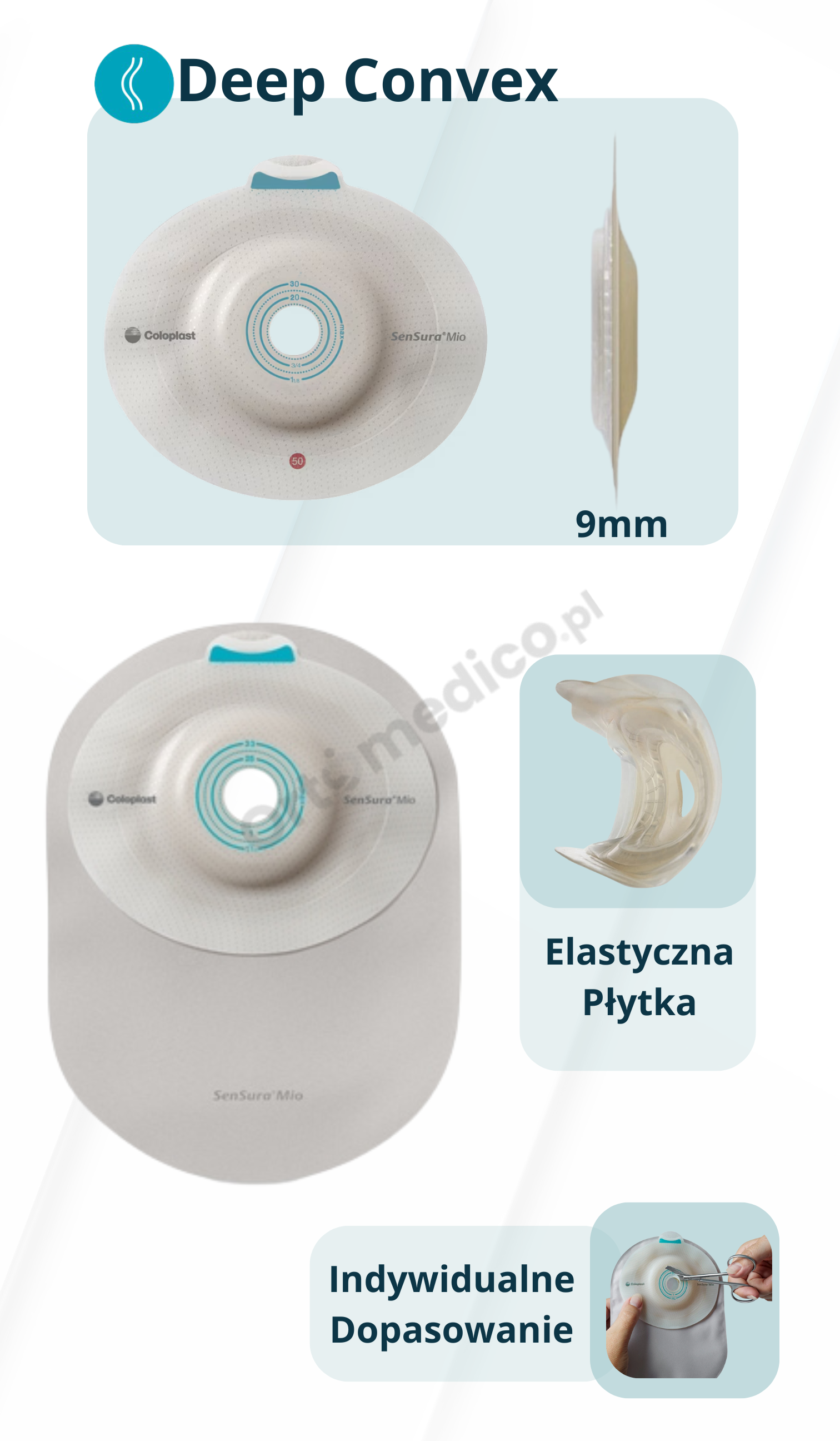 Stabilność i szczelność – specjalnie zaprojektowana płytka Convex Deep unosi stomię ponad powierzchnię skóry, co jest szczególnie ważne przy stomiach cofniętych lub w zagłębieniach. Dzięki temu worek tworzy szczelne i stabilne połączenie ze skórą, znacząco ograniczając ryzyko przecieków. To rozwiązanie daje pacjentowi większe poczucie bezpieczeństwa i pewności w codziennych sytuacjach.