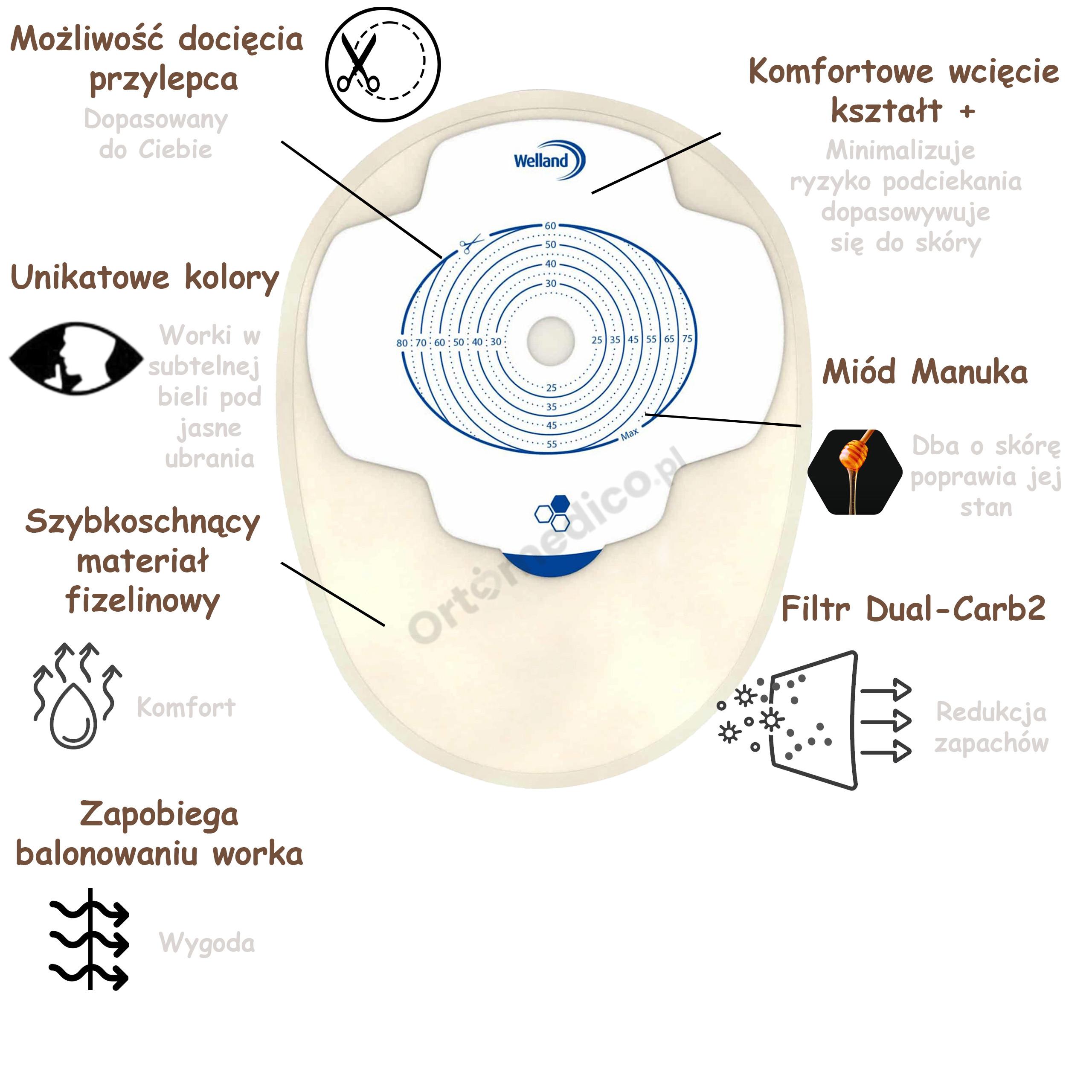 - Hydrokoloidowy Przylepiec z Miodem Manuka: Przyjazny dla skóry przylepiec zawiera hydrokoloidy Welland Hyperflex® oraz certyfikowany miód Manuka o działaniu antybakteryjnym, co wspomaga zdrowie skóry wokół stomii.