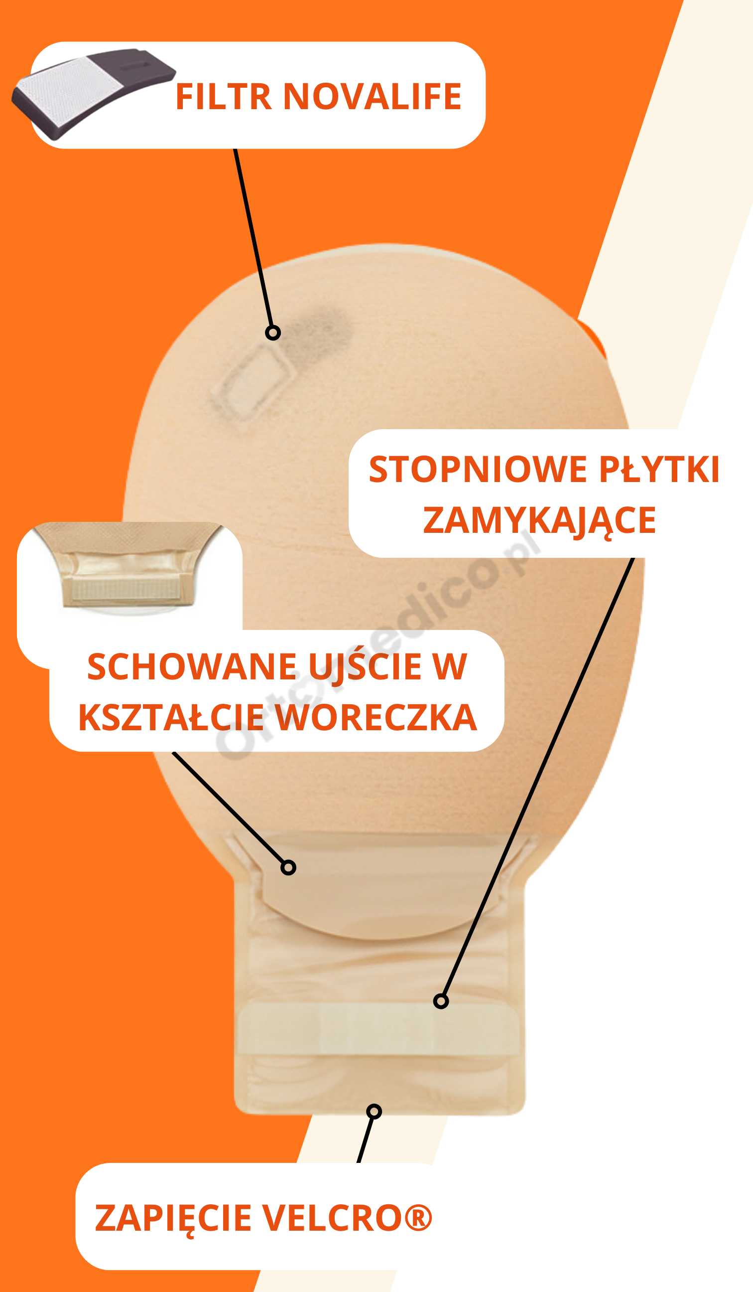 Zintegrowany filtr NovaLife™ skutecznie neutralizuje gazy i zapachy, minimalizując ryzyko balonowania worka. Dzięki temu użytkownik może czuć się pewnie przez cały dzień, bez konieczności ciągłej kontroli.