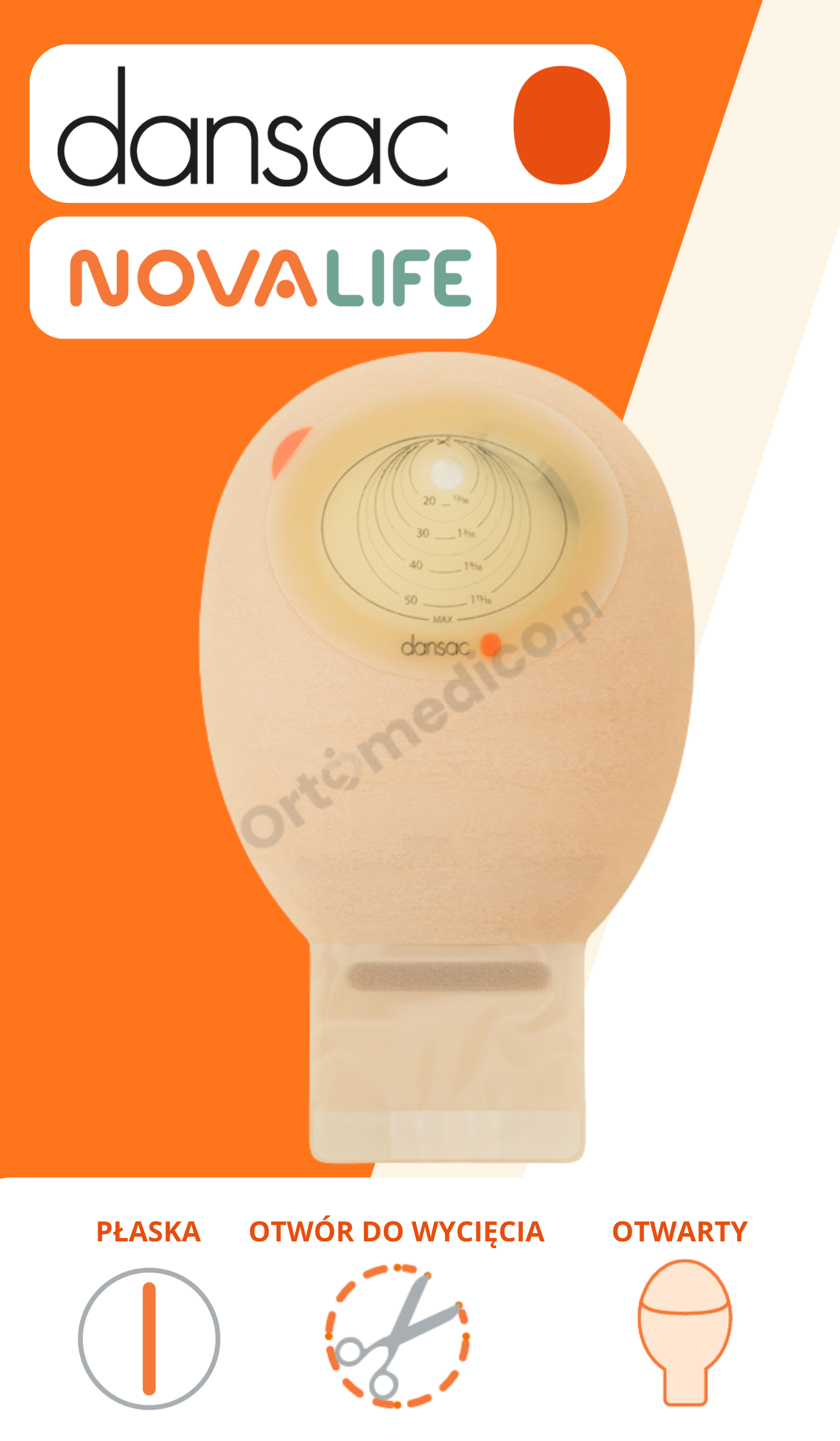 Osłonka płytki wyposażona została w pomarańczową wypustkę, która umożliwia szybkie zdjęcie folii zabezpieczającej — nawet osobom starszym lub niedowidzącym. Widoczna skala umożliwia precyzyjne dopasowanie otworu do wymiarów stomii.