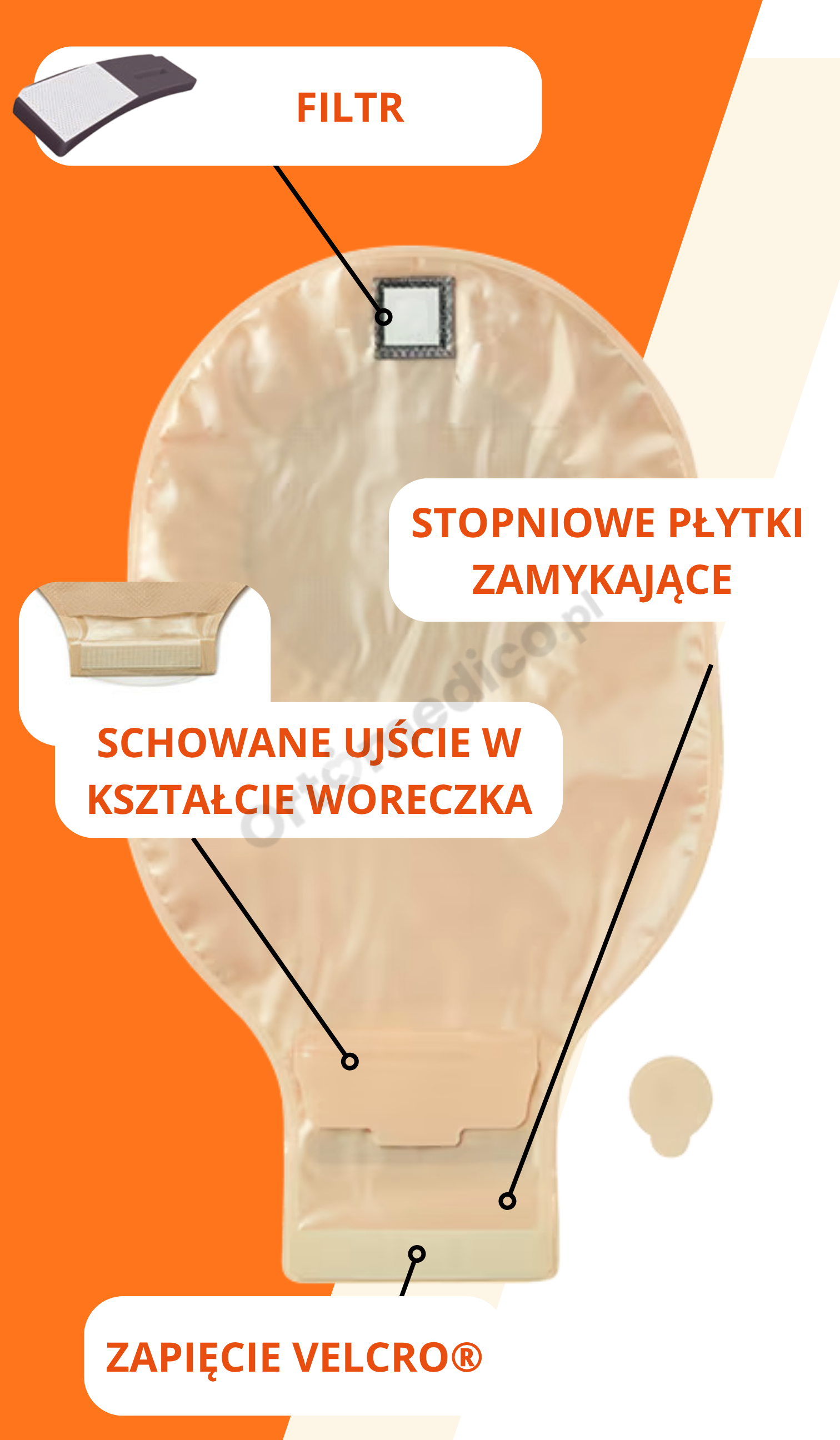 Worek posiada wydajny filtr z węglem aktywnym, który neutralizuje nieprzyjemne zapachy oraz zapobiega gromadzeniu się gazów. Dodatkowo trójwarstwowa folia z tłoczeniami zapobiega przywieraniu treści jelitowej do ścianek worka i ogranicza szeleszczenie – co zwiększa dyskrecję i komfort użytkowania.