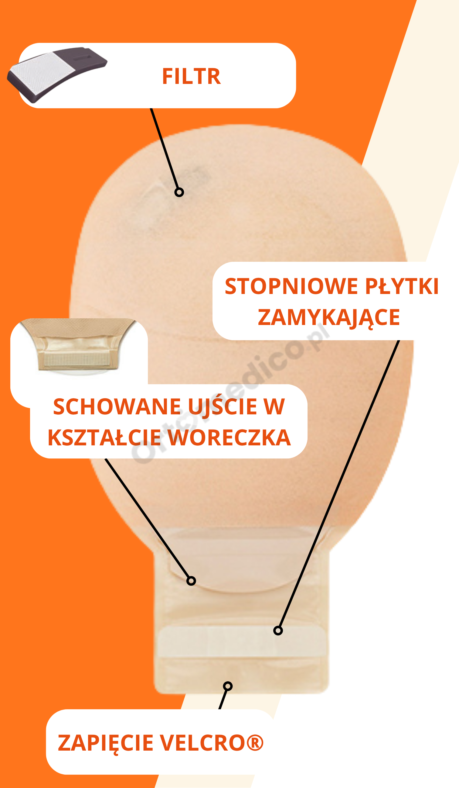 Górne umiejscowienie otworu startowego pozwala, by worek układał się niżej na brzuchu, co wpływa na większą dyskrecję i wygodę – szczególnie pod ubraniem. Rozwiązanie to docenią osoby aktywne fizycznie i zawodowo, dla których naturalny wygląd i swoboda ruchów mają ogromne znaczenie.