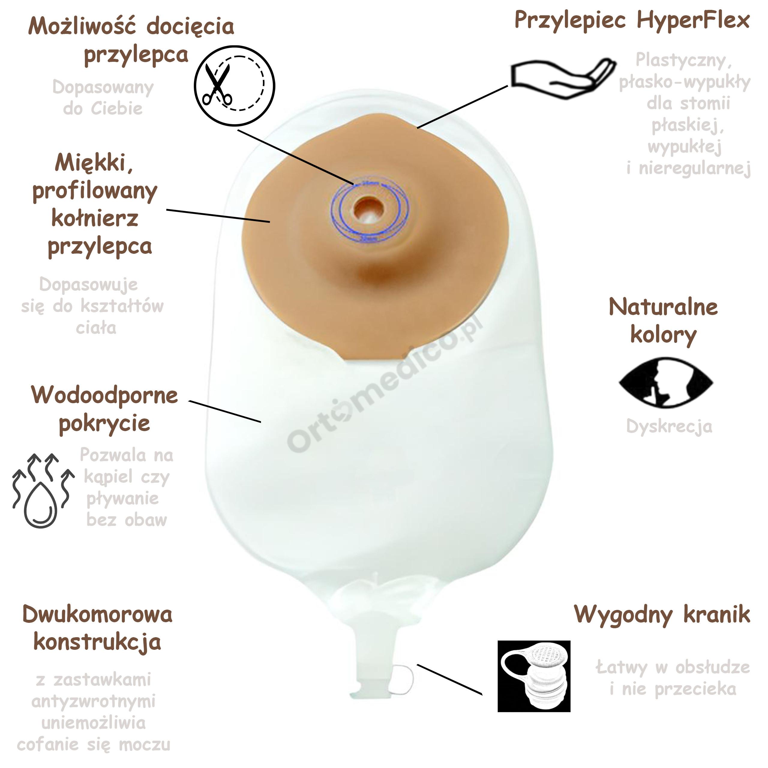 - Plastyczny, płasko-wypukły przylepiec: Wykonany z innowacyjnego materiału HyperFlex®, zawierającego aż 4 hydrokoloidy, zapewnia unikalną kombinację bezpieczeństwa i komfortu.