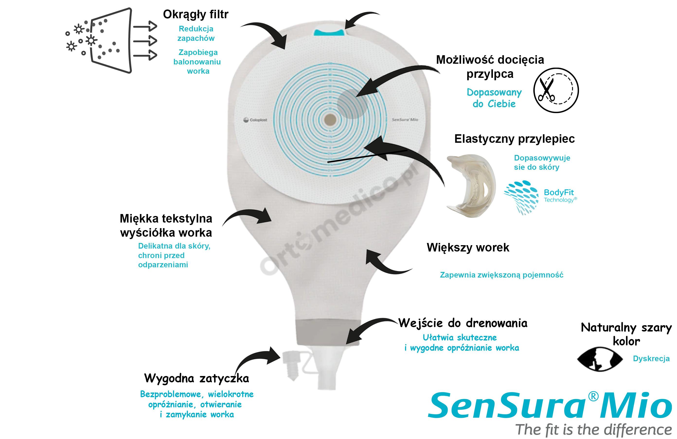 • Elastyczny przylepiec SenSura Mio: Dopasowuje się do ciała, zapewniając długotrwałą szczelność i ochronę skóry przed podrażnieniami.